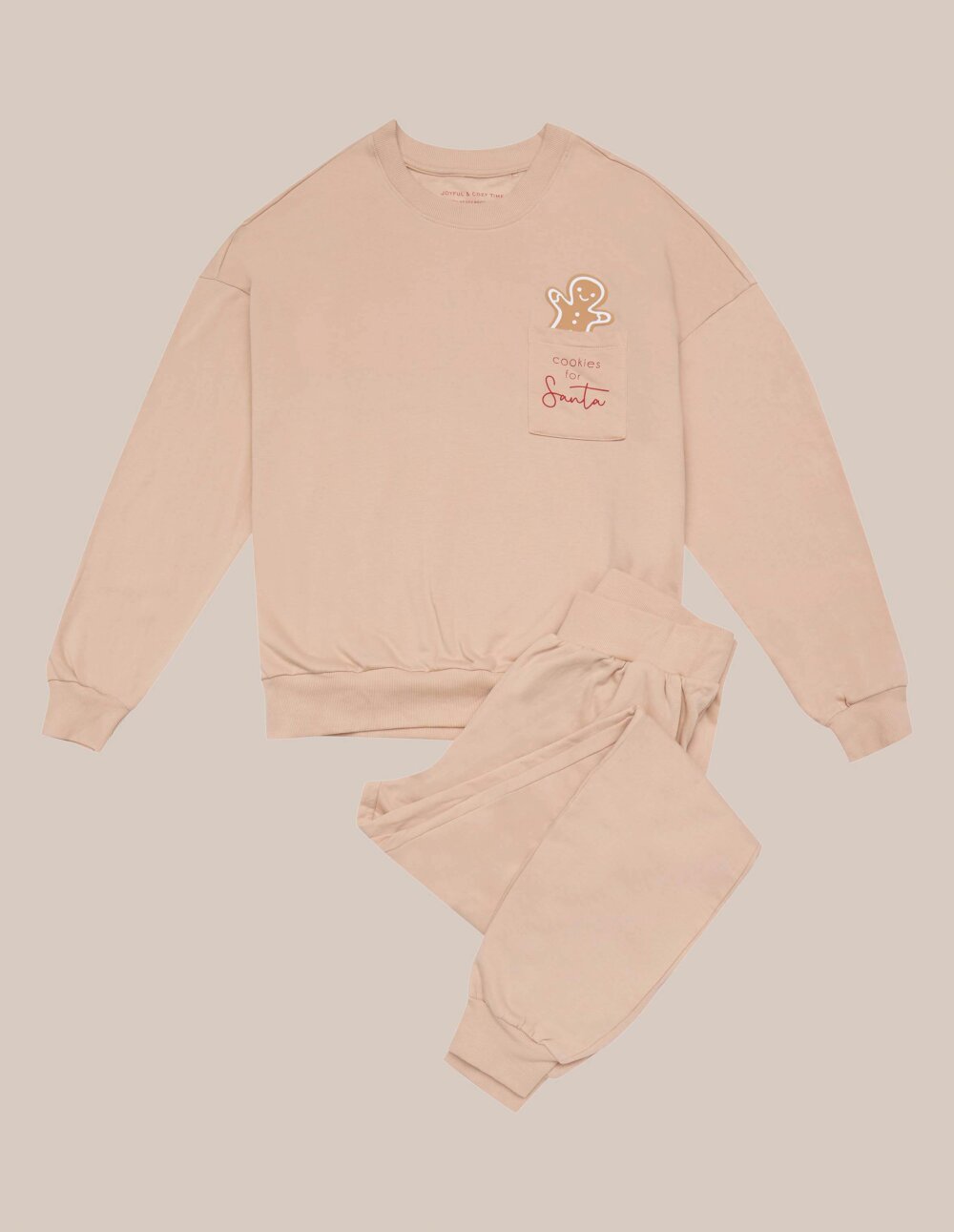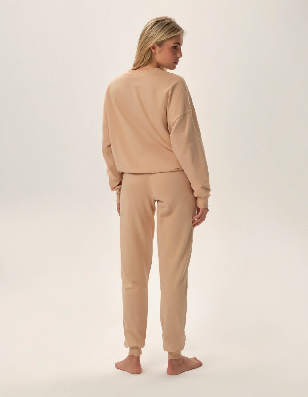 Домашниот комплет Fawn во беж боја ќе ви помогне прекрасно да ги поминете декемвриските денови - во топлина, удобност и празнично расположение. Лабавиот дуксер, мек на допир, е завршен со украсен џеб на градите украсен со нашиот омилен мотив.