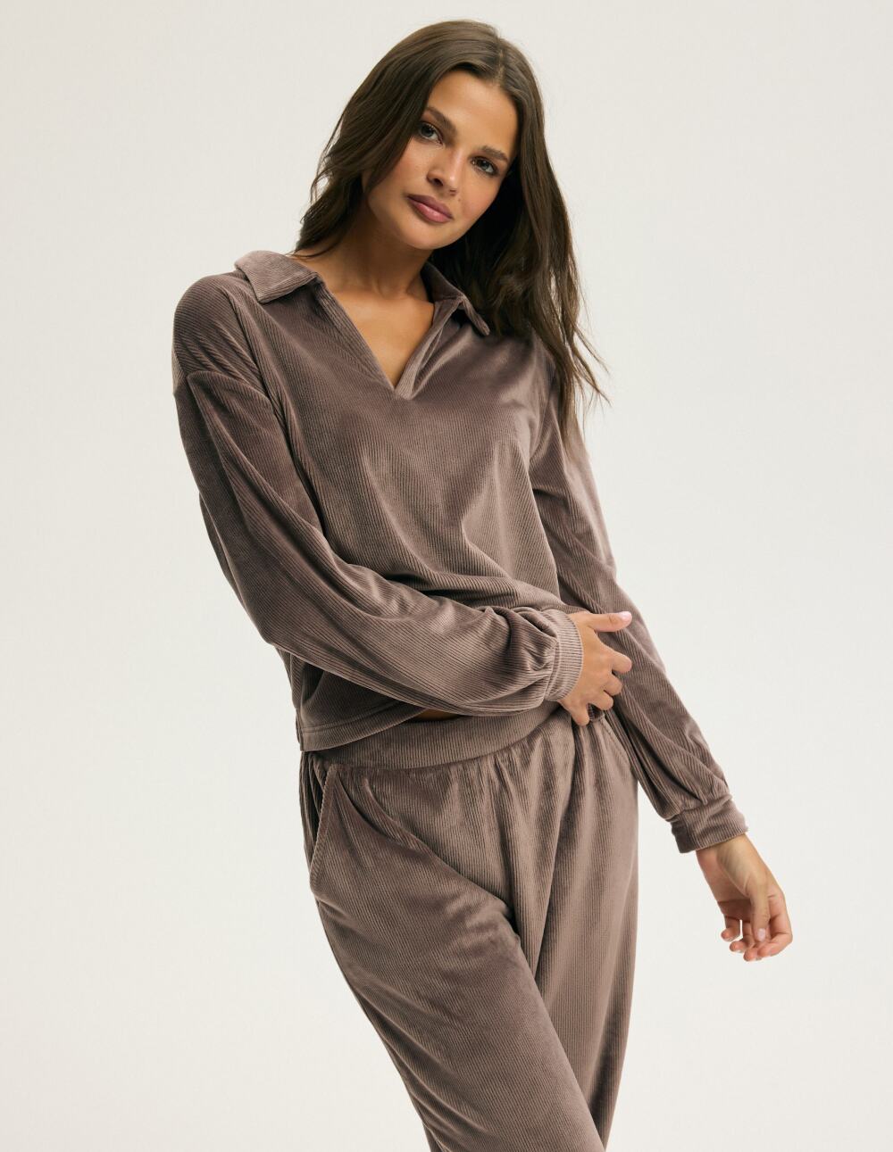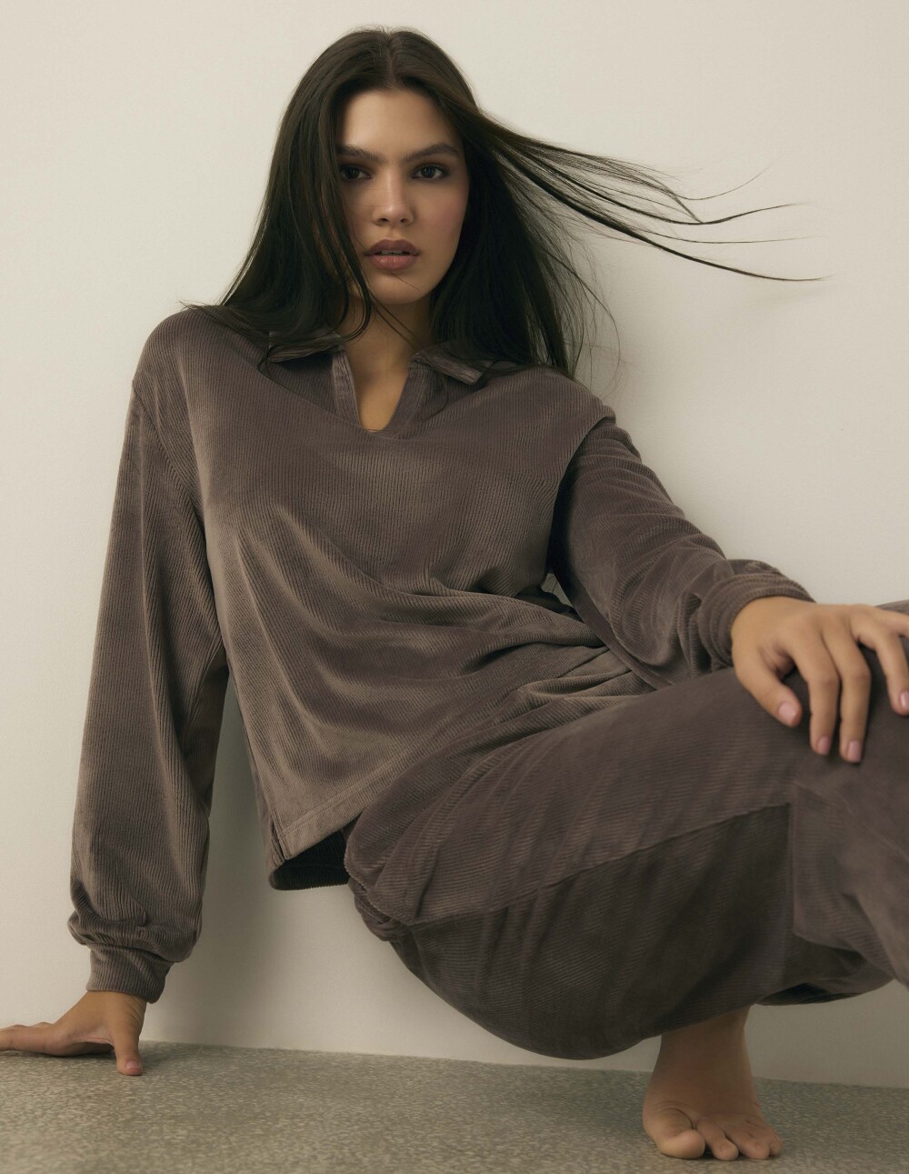 Длабоко чоколадната Кора е квинтесенција на домашната елеганција - мека, обвиткувачка и сензуална во својата едноставност. Кадифената ткаенина блеска со суптилен сјај, додавајќи топлина на секое движење. Лабавиот дуксер со јака и нежно спуштени рамена ја комбинира удобноста со безвременскиот шик, додека малку стеснетите панталони создаваат совршен спој. Овој сет е совршен за прославување на моменти за себе - кога домот станува рај, а удобноста ја добива формата на елеганција.