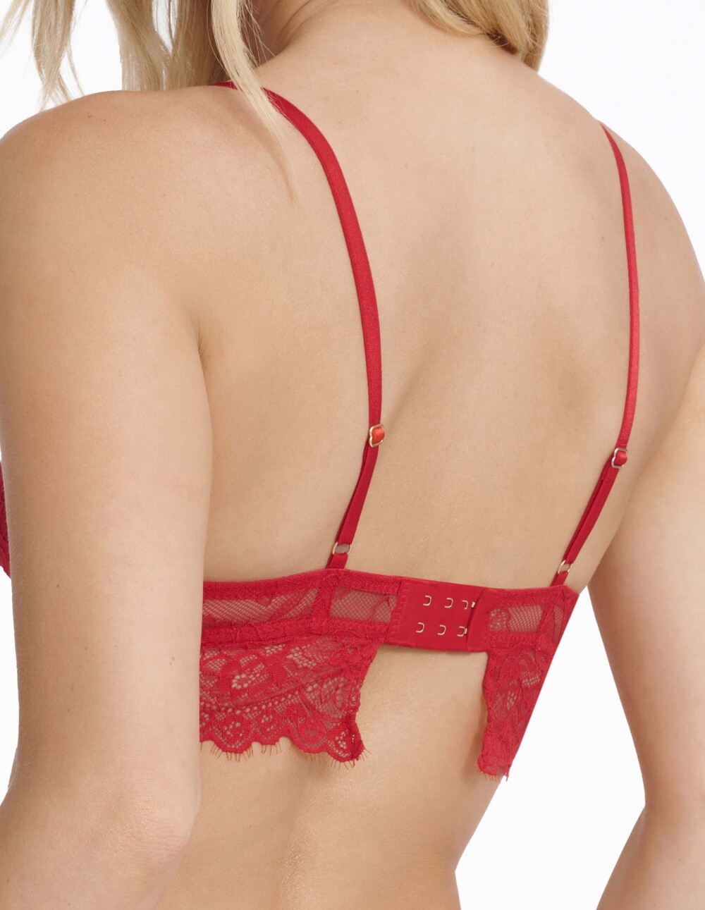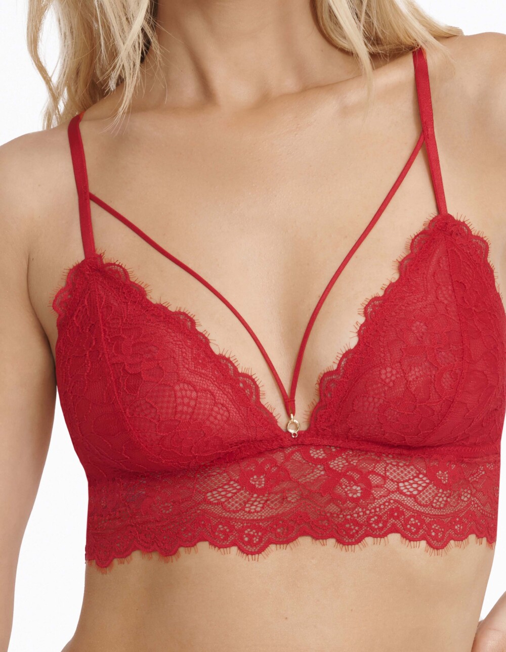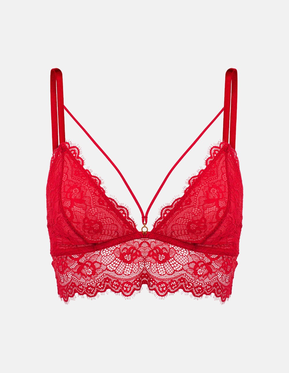 Сензуалната црвена Heyou bralette е дел од колекцијата By Night, создадена за жени кои сакаат елеганција во неглиже. Направен од чипка со изнемоштени рабови, асоцира на фантазијата и магијата на женственоста. Градникот е украсен со подолг памучен горен дел и кокетни ремени на деколтето, прицврстени со двоен златен обрач. Тантела бикини долен дел одлично ќе го надополнат вашиот ноќен стајлинг.