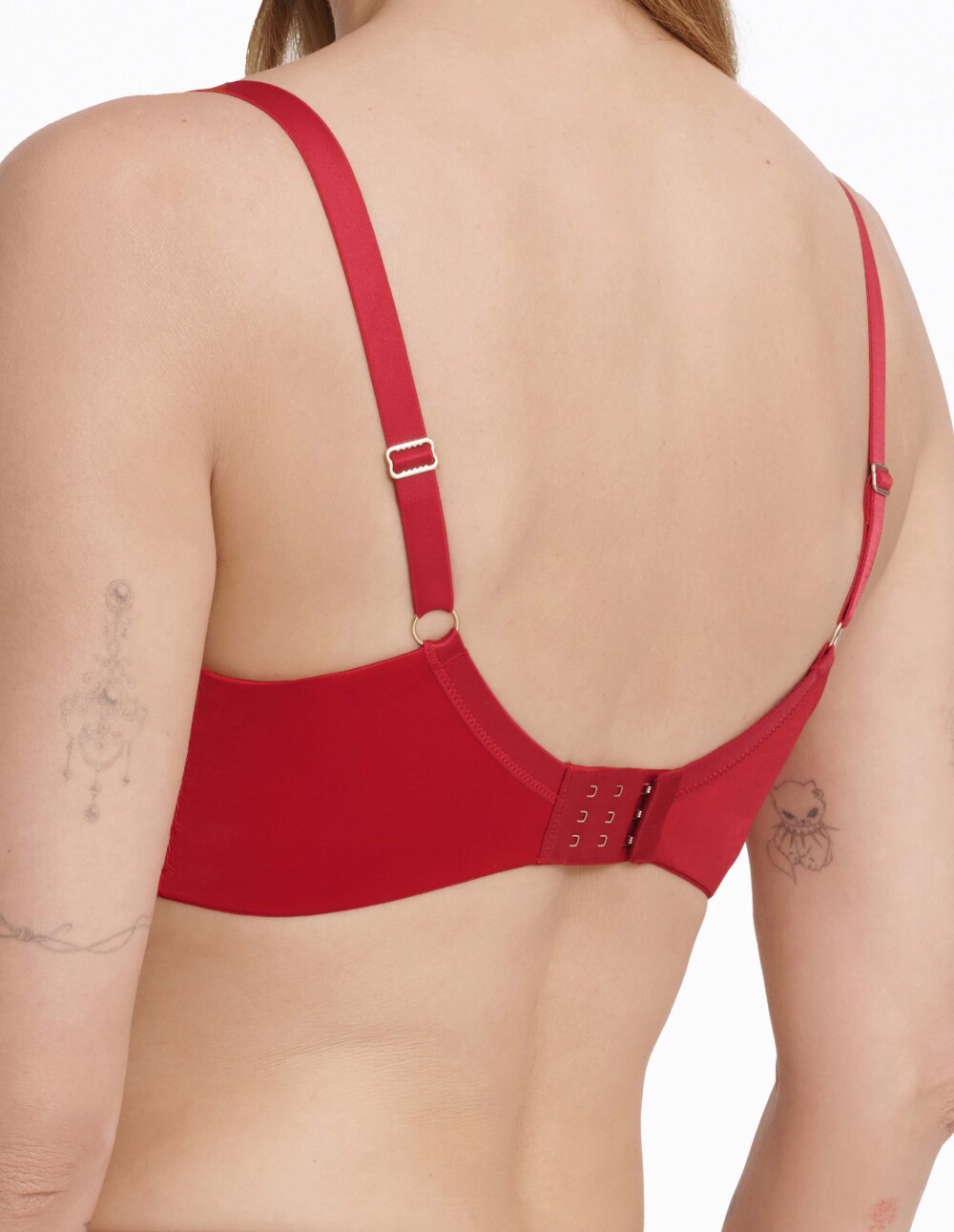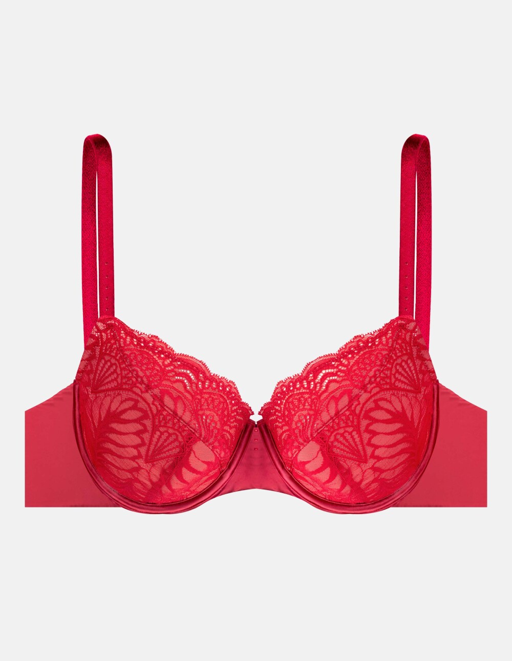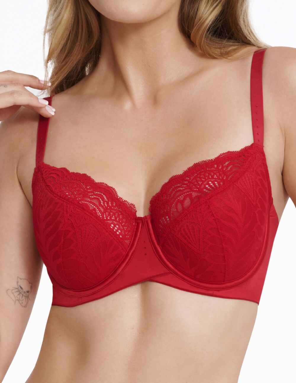 Полуобложениот градник на Изабел во интензивна црвена боја изгледа многу сензуално. Таквата долна облека секако ќе ви даде енергија! Комбинацијата од тантела, полни чашки и памук од малку сјајна ткаенина му дава на градникот Изабел елегантен карактер. Полуобложените чашки ги комбинираат предностите на зацврстените и меките градници, така што ќе ви обезбедат удобност и соодветна поддршка за вашите гради.