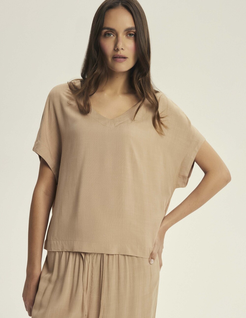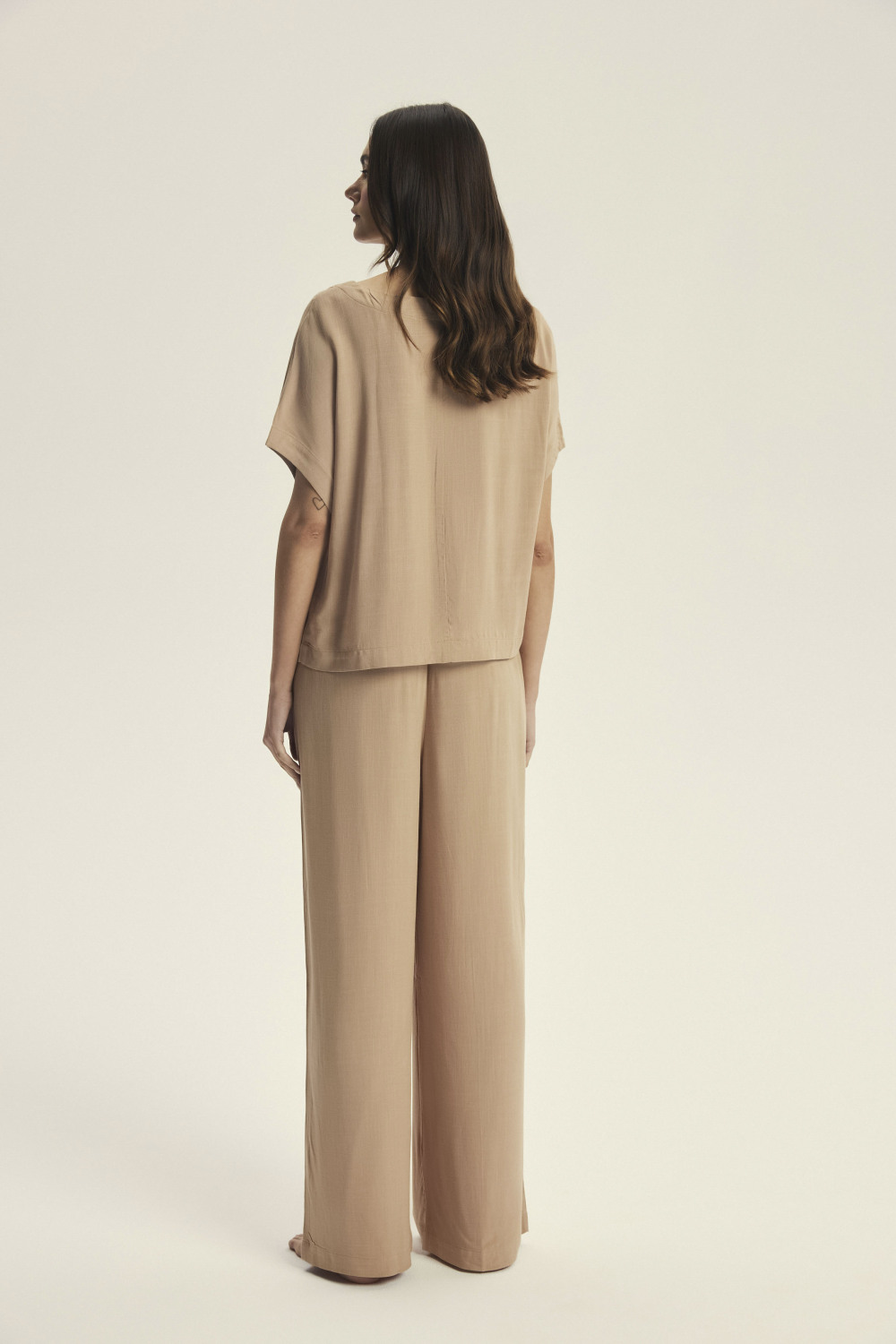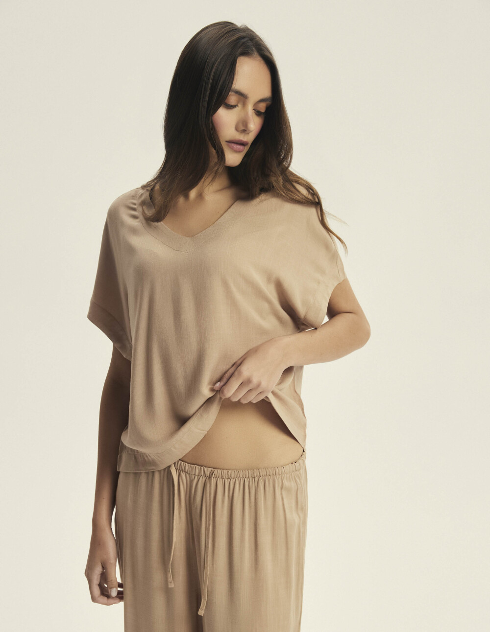 Пижамите Corenso во светло-кафеава нијанса се секојдневно задоволство, завиткани во едноставен, но грациозен дизајн. Светло-кафеавата нијанса ја евоцира топлината на доцното попладне, додека меката, лелеава вискоза го обвиткува телото како омилено ќебе. Кратките ракави и широките ногавици ѝ дозволуваат на кожата да дише, а лабавиот крој овозможува неограничено движење. Ова е избор за жени кои ја ценат удобноста без да жртвуваат женствен изглед.