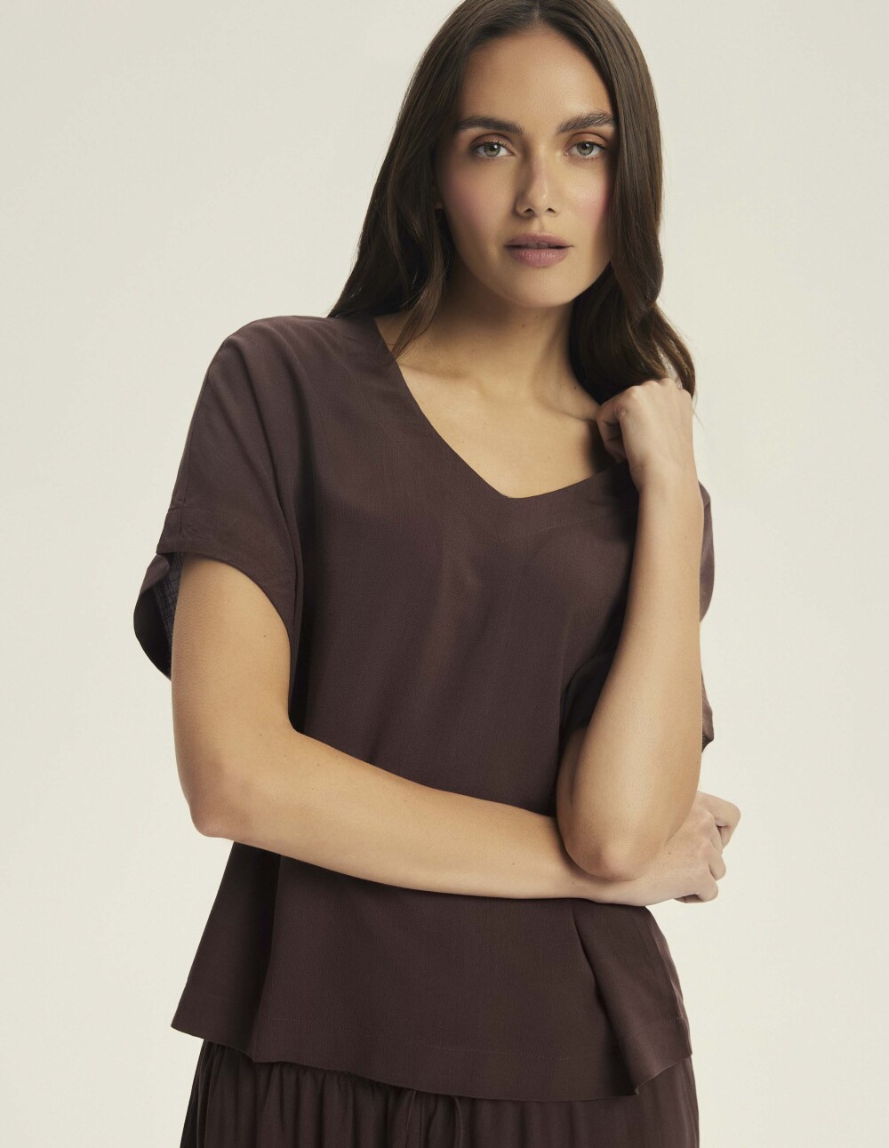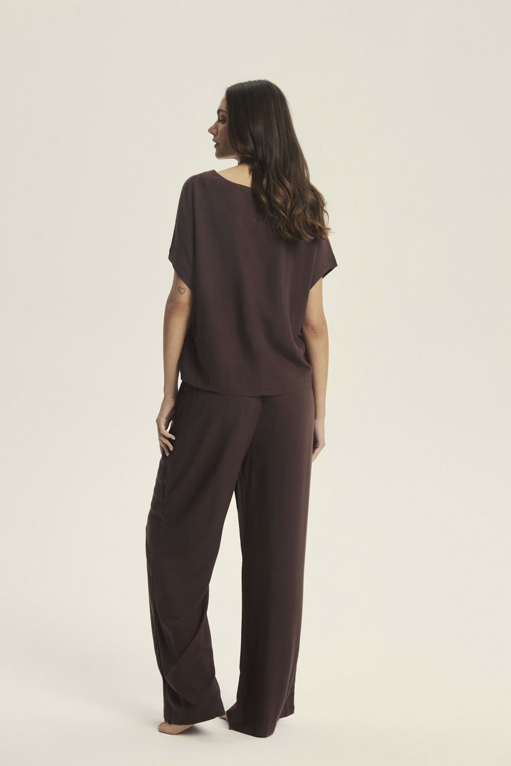 Длабоката чоколадна нијанса им дава на пижамите Corenso аура на сензуална едноставност. Нежната вискоза нежно се прелева преку силуетата, создавајќи чувство на флуидно движење и леснотија. V-изрезот и кратките ракави ги истакнуваат женствените рамена, додека долгите, широки ногавици додаваат допир на леснотија на силуетата. Овој стил ја комбинира удобноста со софистицираноста - совршен и за пред спиење и за лежерни утра со кафе во рака.