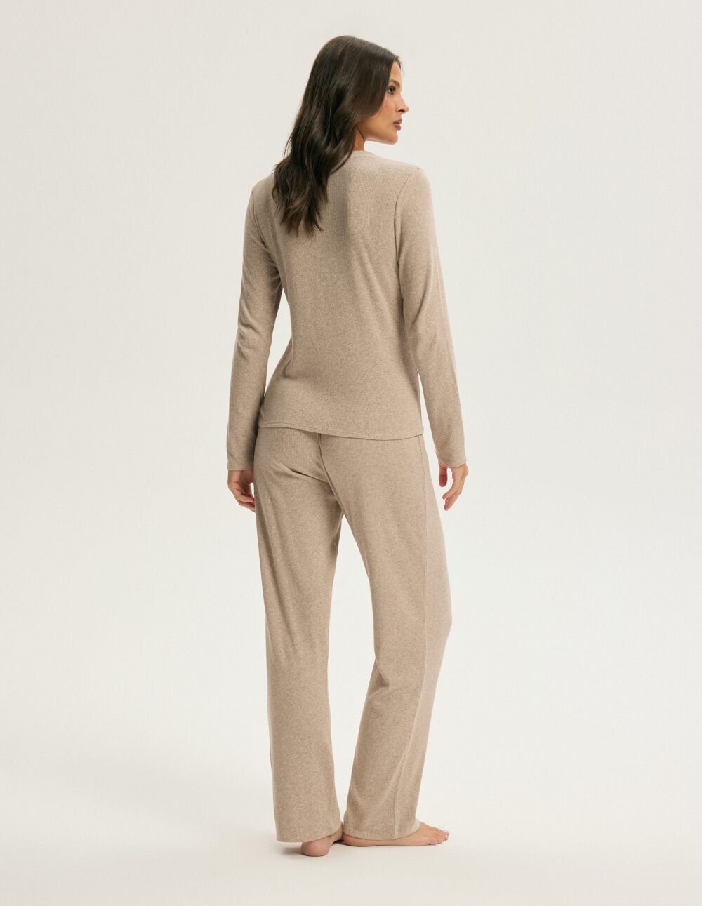 Пижамите „Кори“ во светла нијанса се олицетворение на мирни утра и меки вечери. Нивната мешавина од памук и вискоза нежно го обвиткува телото, како ќебе од светлосни зраци - лесни, дишечки и природно топли. Фините ребрести манжетни додаваат суптилна текстура, додека V-изрезот со мало закопчување плени со својата едноставност и софистицираност. Лабавите, малку раширени панталони овозможуваат слобода на движење, а воедно се обвиткуваат грациозно. „Кори“ е пижама што го редефинира значењето на „одмор“ - не само за телото, туку и за умот.