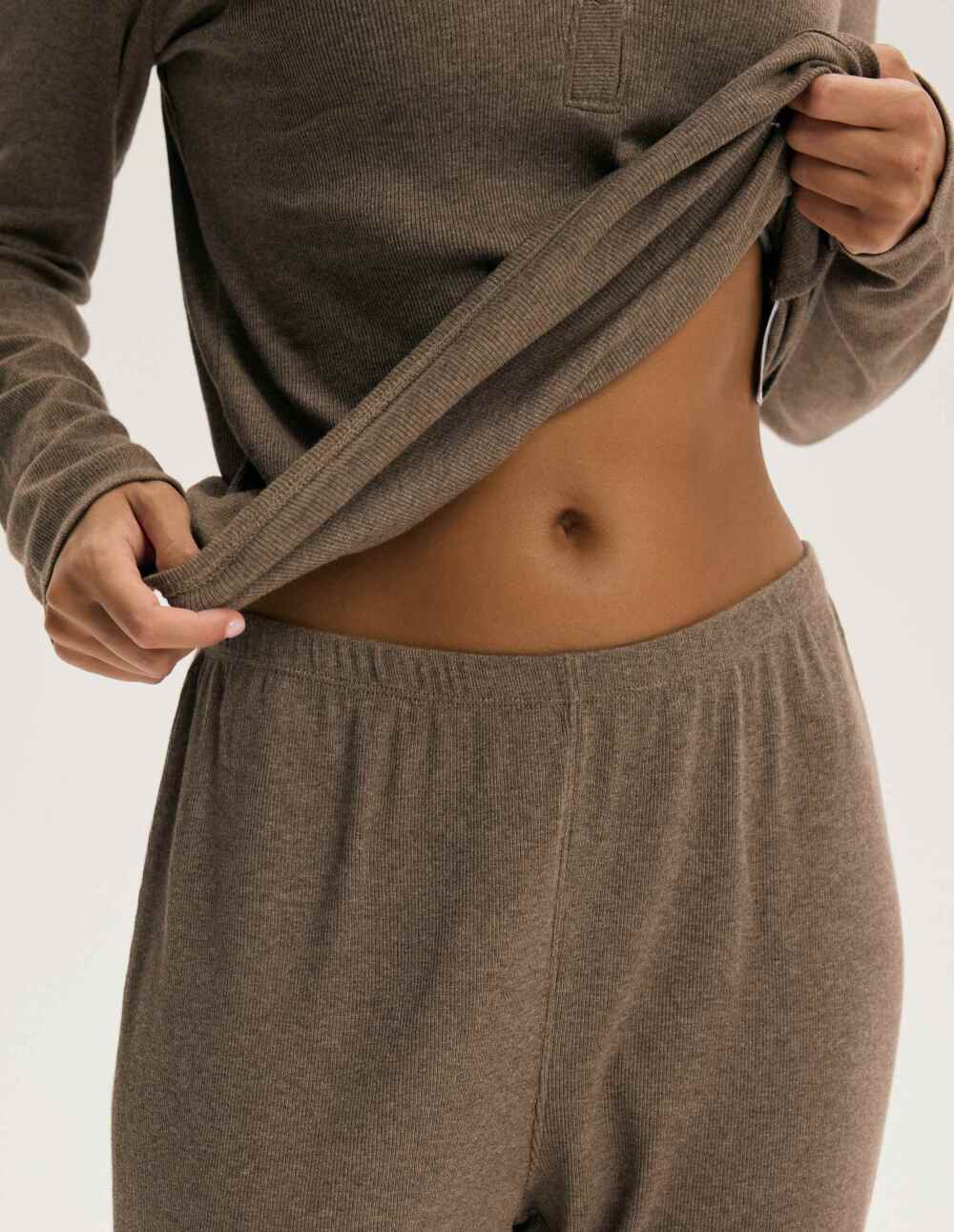 Во топла нијанса на кафе, пижамите Cori се синоним за вечерна утеха. Нивниот мек памучен и вискозен плетен материјал го обвиткува телото со суптилна тежина, создавајќи чувство на удобност и удобност. Малите копчиња на деколтето додаваат женствен допир, додека долгите, слободно паѓачки панталони нагласуваат опуштена, удобна силуета. Овие пижами се совршени за дневни ритуали за релаксација - читање во кревет, тивко утро со кафе и бавни моменти што имаат вкус на мир. Кафеавиот тон на ткаенината носи хармонија и беспрекорно се вклопува со топлината на вашата кожа