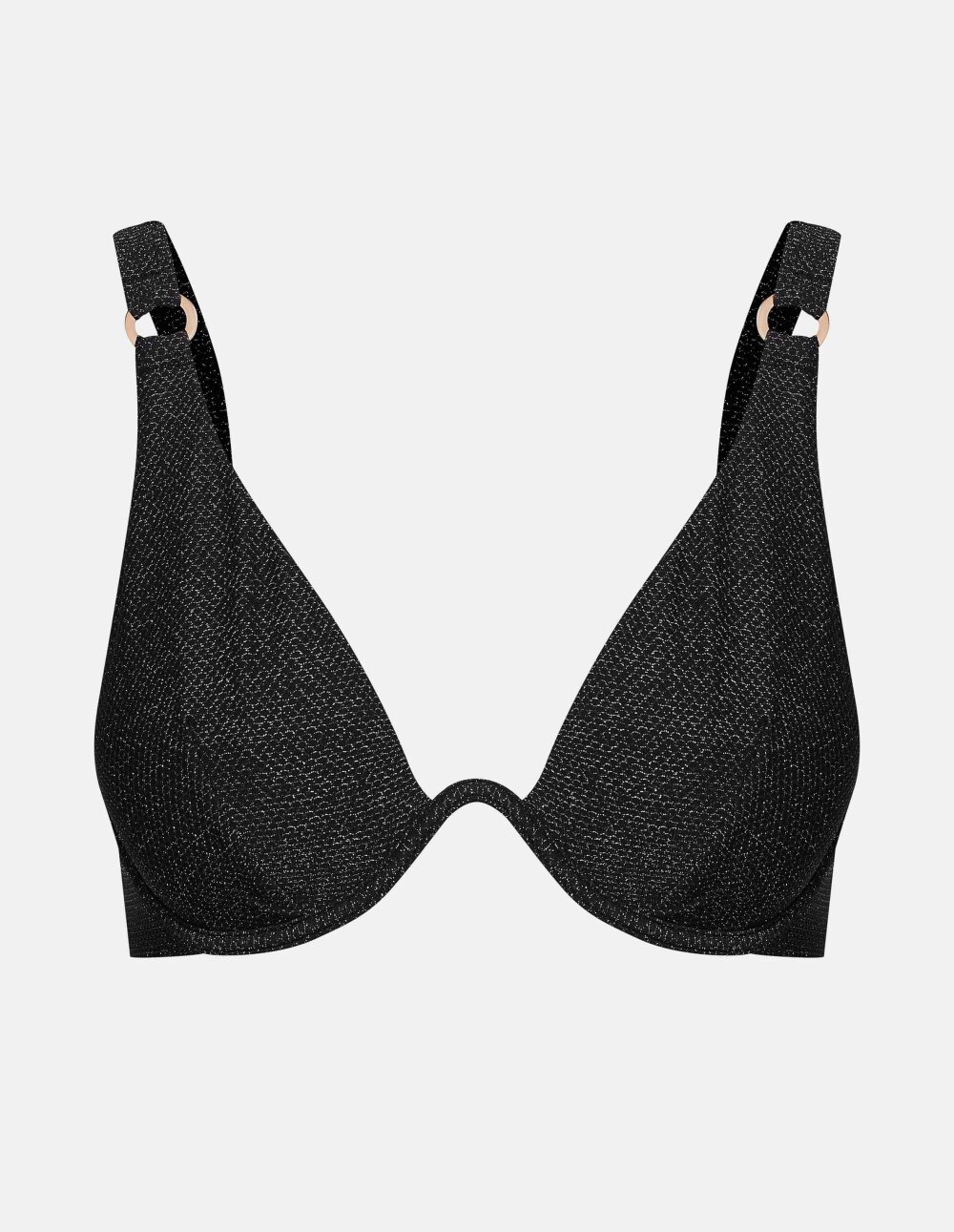 Дали сакате да привлекувате внимание и да избирате облека што ве истакнува? Тогаш црниот мек бикини топ од Stardust е совршено решение за вас! Се одликува со метализиран конец кој буквално ќе ве остави да заблескате! Друг интересен елемент на ова бикини е необичната, малку закривена спојка на чашките.