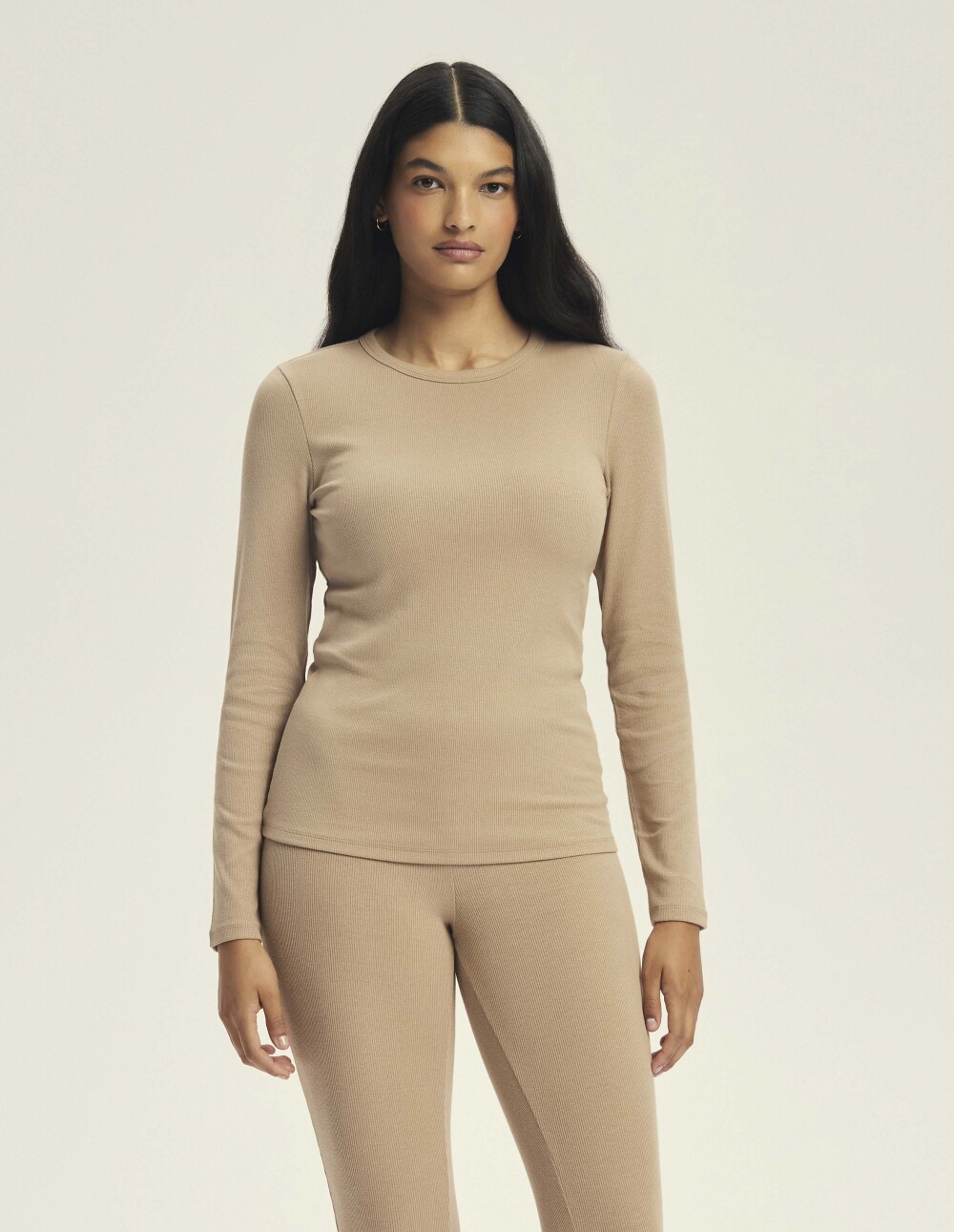 Бежовата Jody е ода на природноста - смирена, елегантна и без напор стилска. Неговиот припиен крој ја прегрнува фигурата како втора кожа, додека суптилните ребрести детали додаваат длабочина и карактер на меката структура. Мешавината од памук и вискоза му овозможува на материјалот да дише и да се лее со телото, создавајќи пријатно чувство на обвиткување. Тоа е совршена основа - безвременска и рафинирана, дизајнирана да се носи и во слоеви и сама.