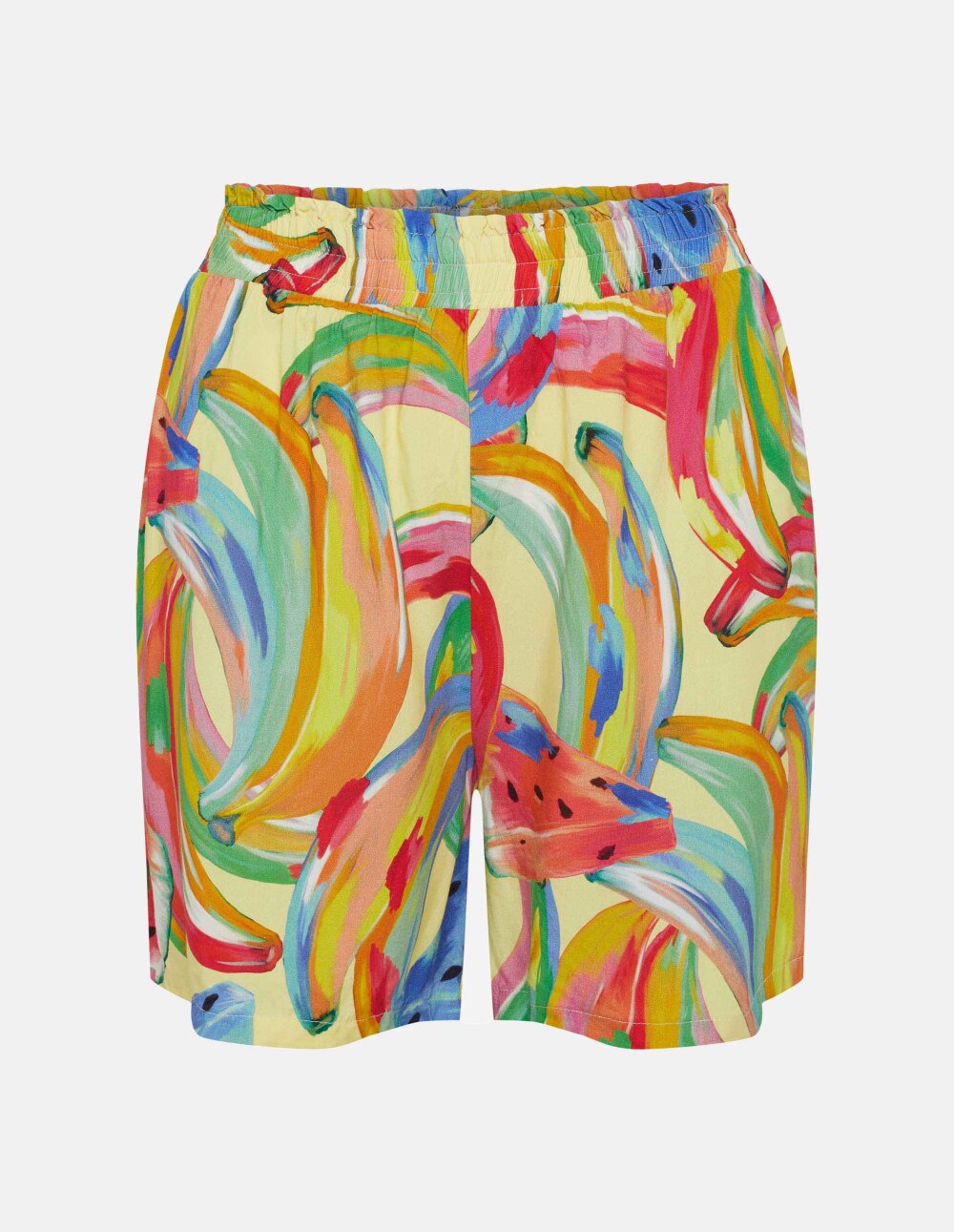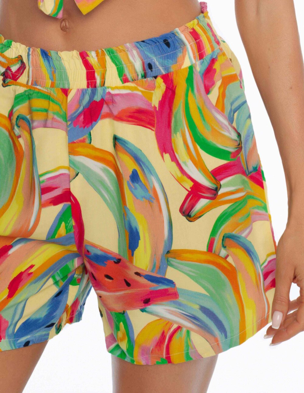Шарените панталони Kaia се празничен модел со енергични овошни дезени. Ова се удобни шорцеви со широк крој - совршени за носење преку костим за капење. На половината има еластична лента без притисок, што ја зголемува удобноста при носење. Дополнително, овие летни шорцеви се целосно изработени од пријатна вискоза на допир, која е совршена за топлите денови.