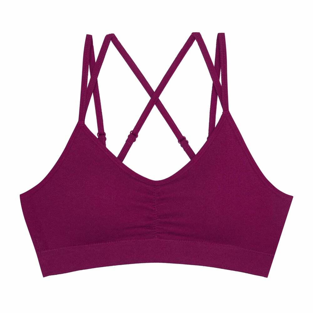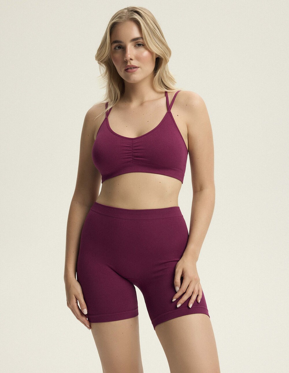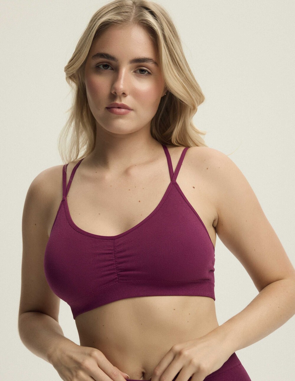 Горниот дел од Bloovii Kyleena ја комбинира спортската леснотија со женствениот шарм. Нежно ребрестата ткаенина во длабока нијанса на слива суптилно ја нагласува линијата на градите, додавајќи модерен допир на целокупниот изглед. Бесшевната конструкција го обвиткува телото во удобност, додека отстранливите влошки овозможуваат прилагодување на контурите. Тенките прерамки што се вкрстуваат на задниот дел создаваат нежна линија што додава динамична и сензуална суптилност на дизајнот.