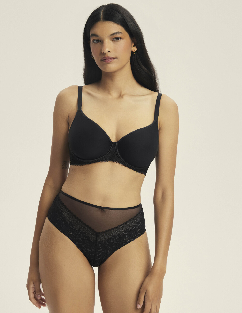 Во црниот градник Nickita, силата на женственоста се среќава со мекоста на формата. Мазните корпички прекрасно го обликуваат и поддржуваат градите, создавајќи природна, заоблена форма, додека суптилната чипка околу градите додава леснотија и софистицираност. Овој градник во форма на маица, благодарение на својата конструкција инспирирана од растојание, ја комбинира удобноста со совршено прилегање. Жиците обезбедуваат стабилност, а тенките, прилагодливи ленти суптилно го надополнуваат изгледот. Елегантен, секојдневен, а сепак сензуален во своите детали.