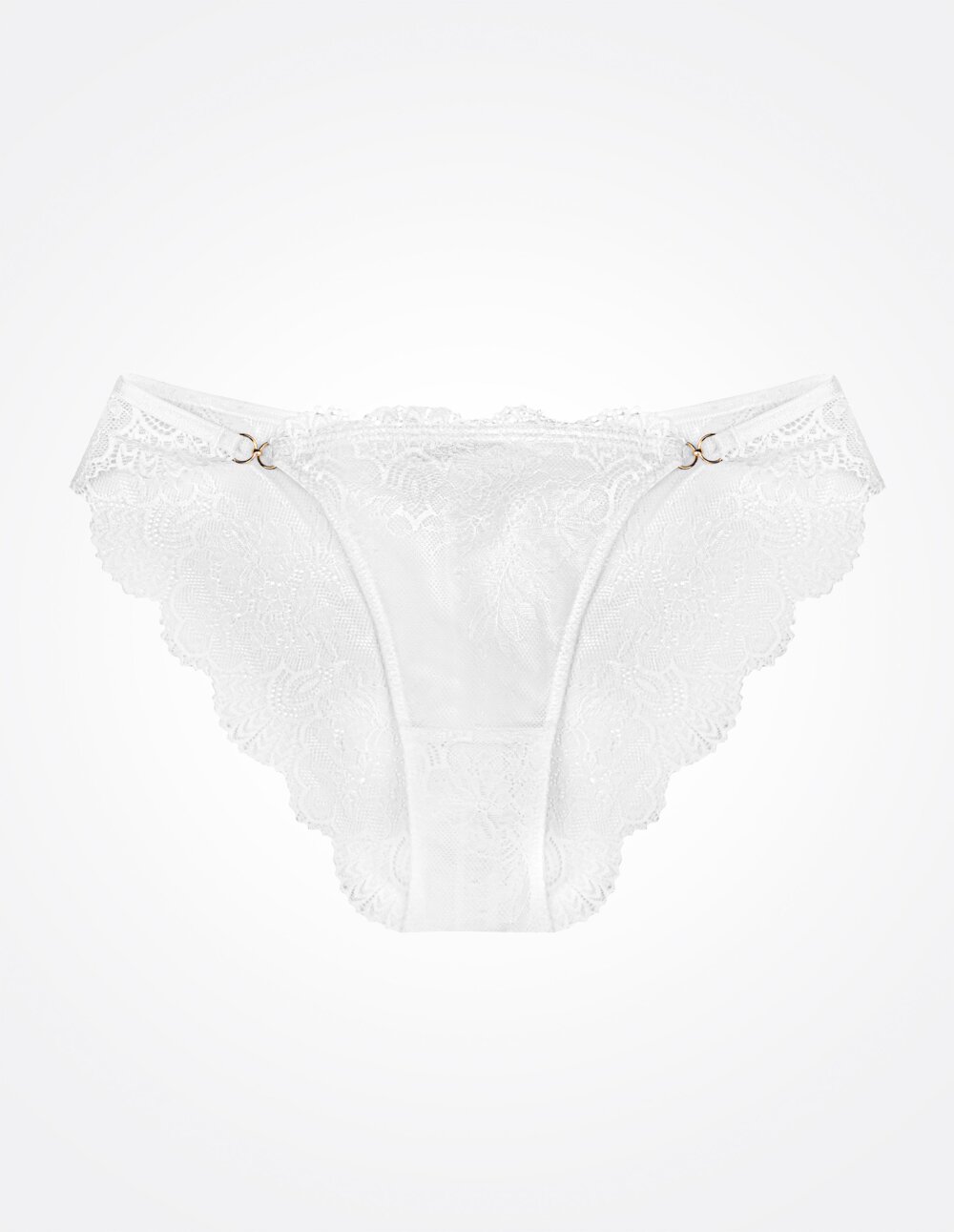 Дали ви се допаѓа елегантна долна облека која ќе прави да се чувствувате посебно секој ден? Изберете бели гаќички Рамира, воодушевувајќи се со нивниот уникатен карактер. Белите гаќички се направени од цветна чипка. Тие се одликуваат со украсни двојни златни кругови. Тоа не е само суптилна декорација, туку и начин за поврзување на предната и задната страна на гаќичките.
