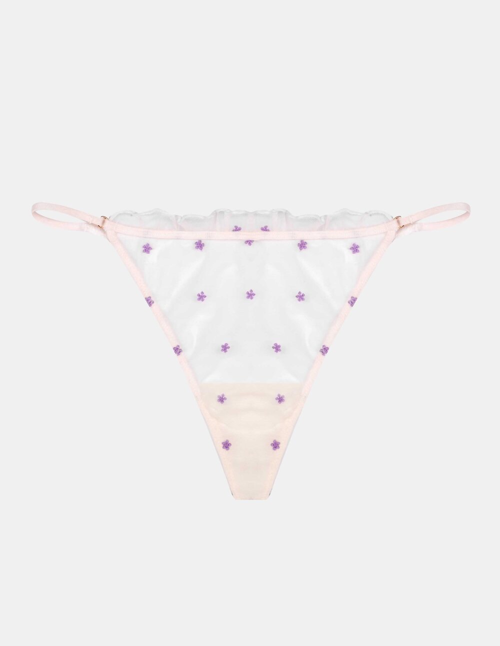 Белата танга Holly направена од два проѕирни триаголници е модел кој комбинира деликатност со сензуалност. Главните елементи - предните и задните панели - се поврзани со тенки, рамни гумени ленти и златни прстени за накит. Во задниот дел на задникот и предниот дел на абдоменот се зашиени деликатни возбудувани, кои додаваат женствен, суптилен карактер на моделот. Внимавајте и на нежниот, сензуален вез - виолетови цветови кои прекрасно се усогласуваат со белата мрежа.