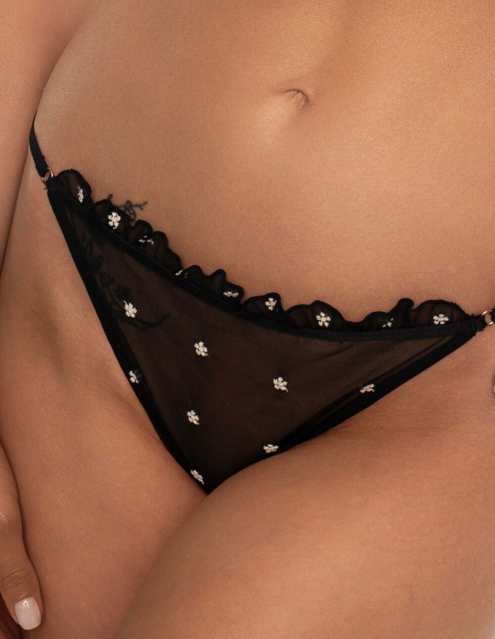 Црната, оскудна танга Холи е совршен избор доколку барате сензуална долна облека. Зошто? Гаќичките беа направени од два проѕирни триаголници, кои беа поврзани со тенки ластичиња и златни додатоци. Забележете ги суптилните цветни везови и нежните возбудувања зашиени во задникот и долниот дел на стомакот. Ова е модел кој лесно се губи умот!