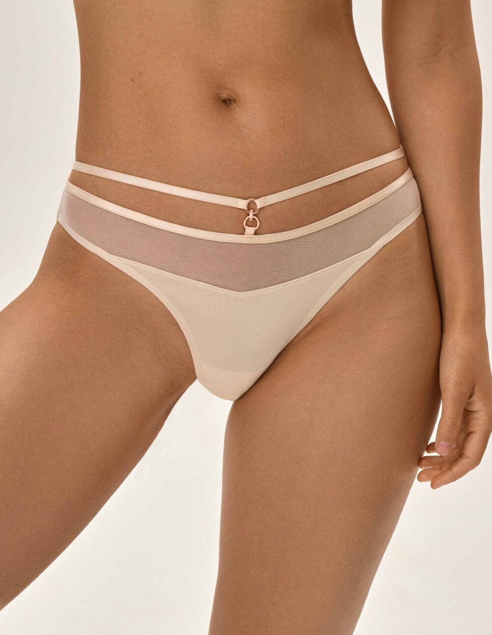 Дали ви се допаѓаат минималистичките трендови? Тогаш не двоумете се да ја изберете тангата Ova во беж боја, која ќе ве воодушеви со својата префинетост во секој детал. Станува збор за танга со модерен карактер, со мрежеста влошка на предната и задната плоча. Внимание привлекуваат и декоративниот додаток на грбот и естетското лепење.