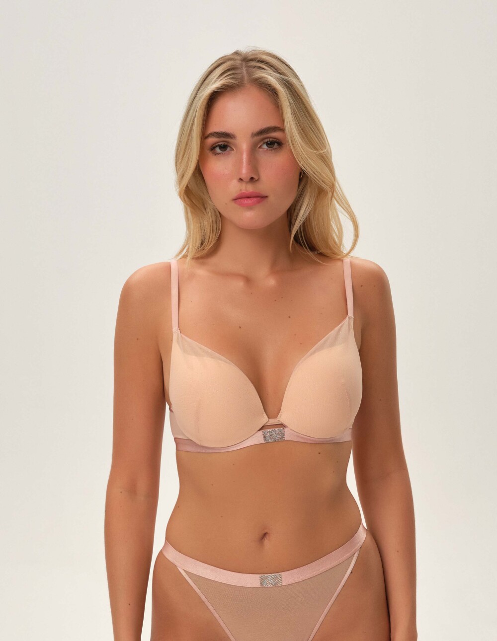 Беж танга Othilia е одличен избор и за секојдневни и за специјални пригоди! Светлата боја ќе остане невидлива дури и под белите панталони. Високиот струк и широкиот, удобен еластичен појас и даваат на долната облека спортски карактер. Во исто време, тангата Othilia е сè уште многу женствена: украсите и додаваат карактер – сјајни честички на материјалот и кристали поставени на ластикот.