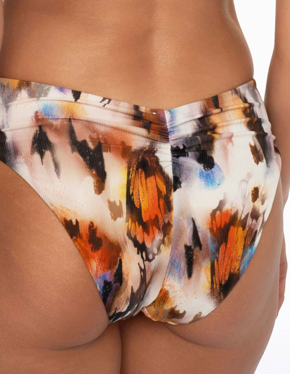 Авантуристичкиот бикини долен дел ќе ве воодушеви со својот оригинален принт во кафени и сини бои. Изработен е и од интересен материјал со нежни пруги, а има украсно собирање на задниот струк. Дополнително, гаќичките од костим Adventure се исечени со буквата V - и напред и над задникот.