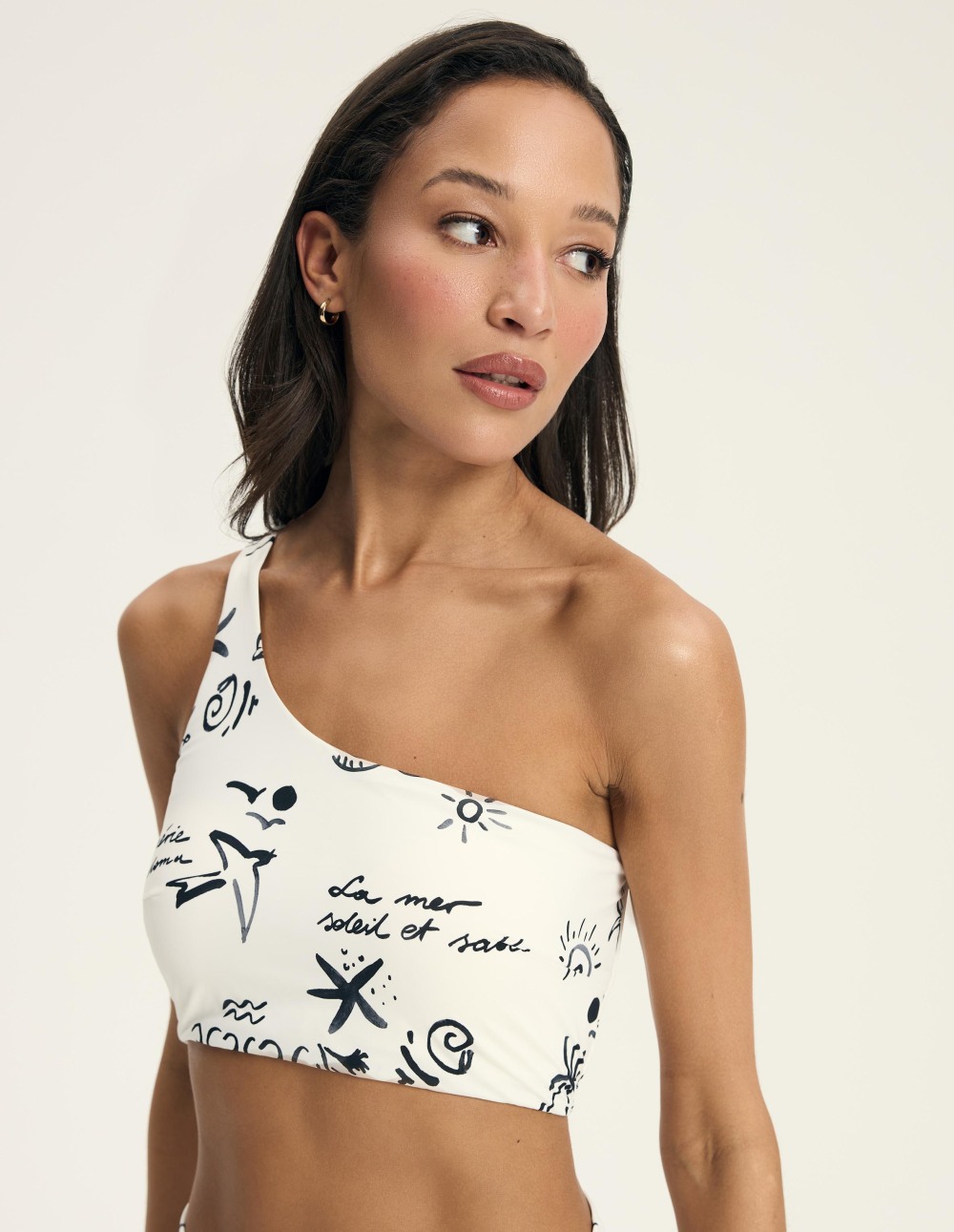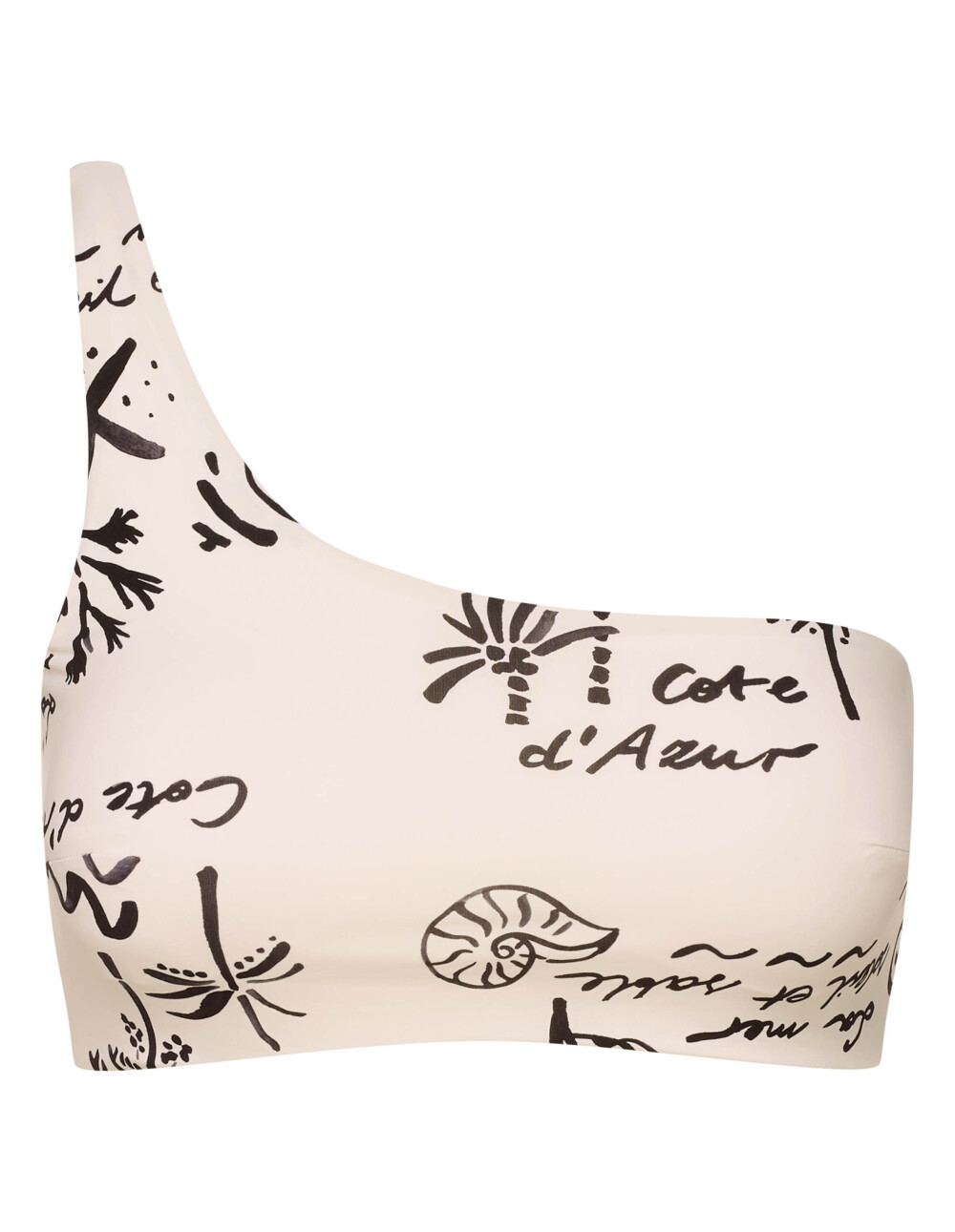 Горниот дел од бикинито „Фиренца“ импресионира не само со својот асиметричен крој, туку и со празничниот принт што му дава летен шмек. Моделот со едно рамо и нежни пружини по должината на деколтето се вклопува во актуелните трендови на плажа и совршено функционира.