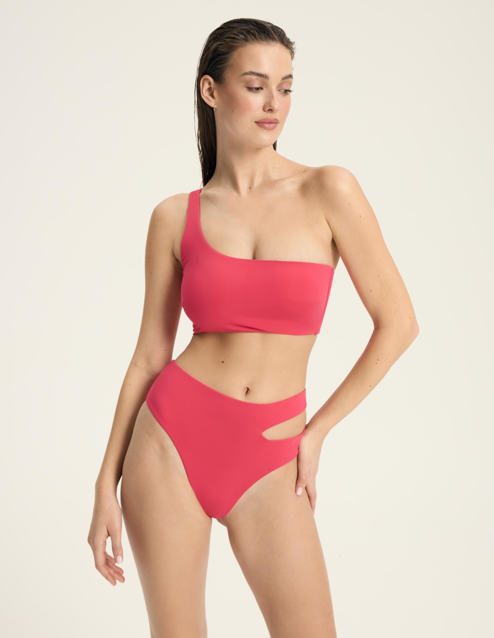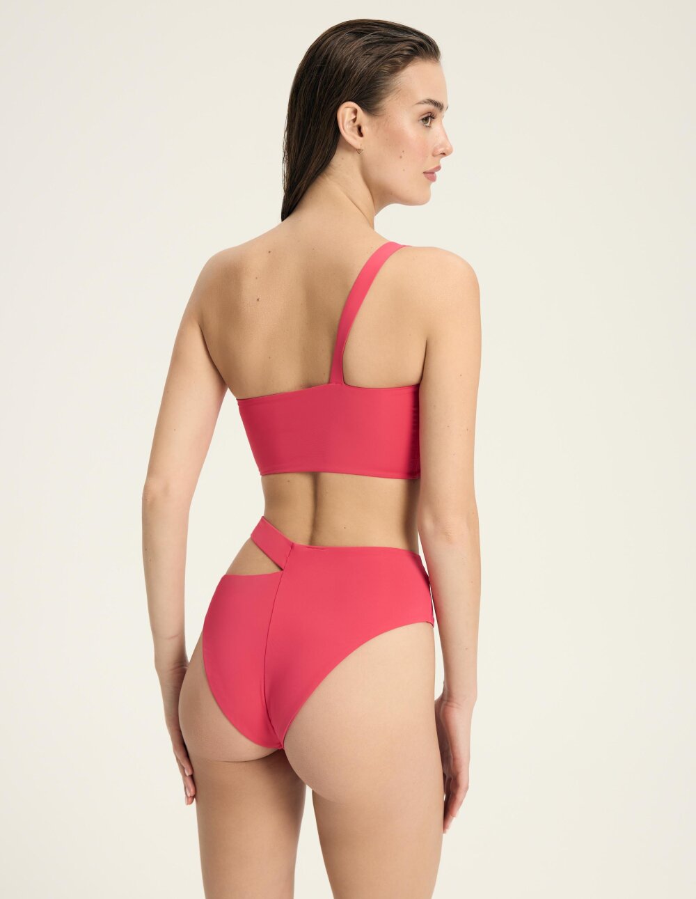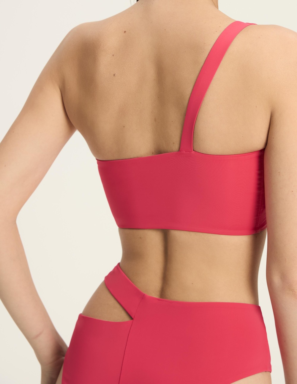 Горниот дел од бикинито Firenze во интензивна боја на малина е израз на минималистички дизајн во модерно издание. Моделот се издвојува со својот асиметричен крој со една широка прерамка на десното рамо и мазна површина без декоративен шев.
