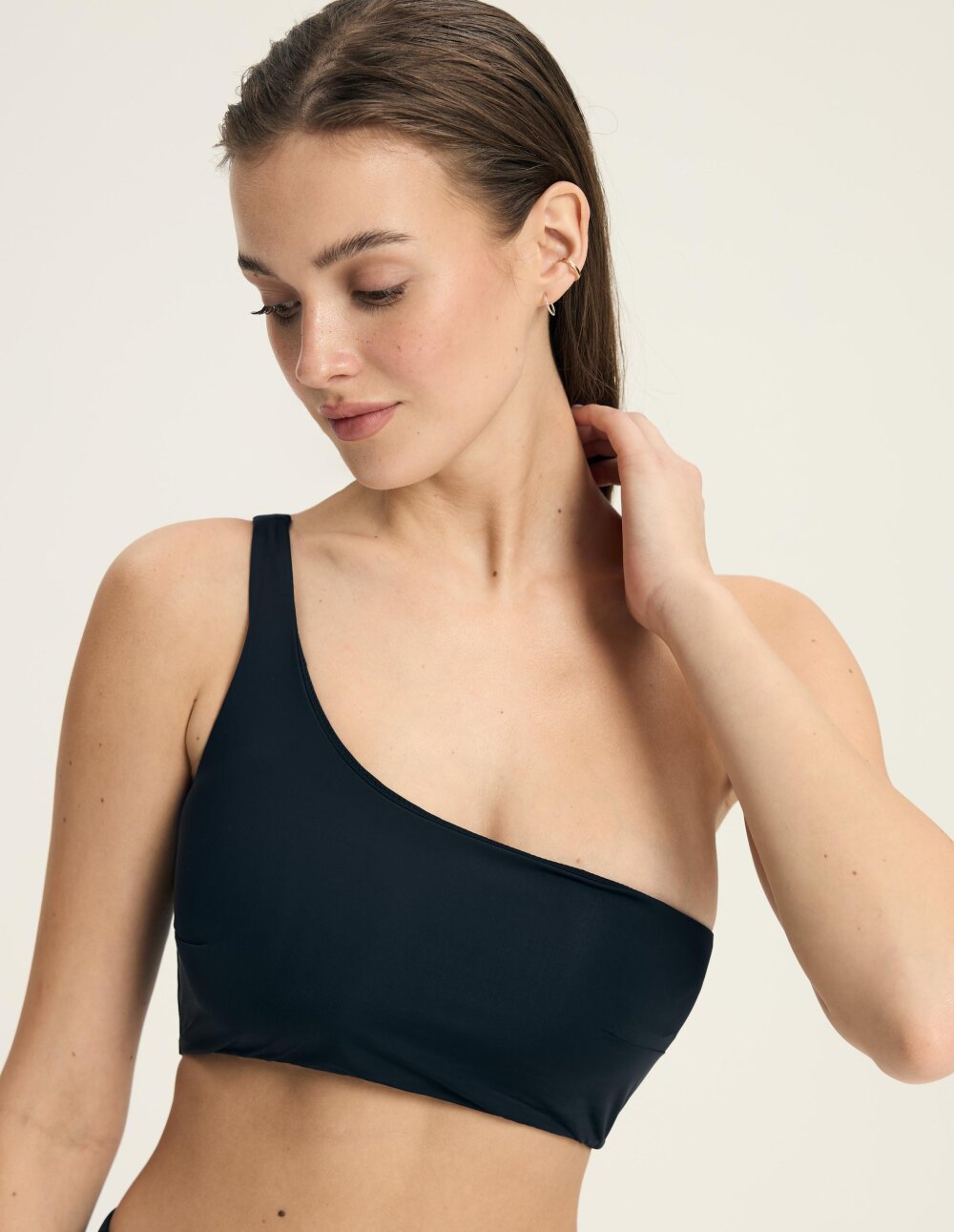 Црниот бикини горен дел од Firenze е минималистичка и модерна опција во категоријата бикини. Асиметричниот дизајн на едно рамо и мазната површина создаваат чиста, геометриска форма. Класичен костим за капење што може да се носи самостојно.