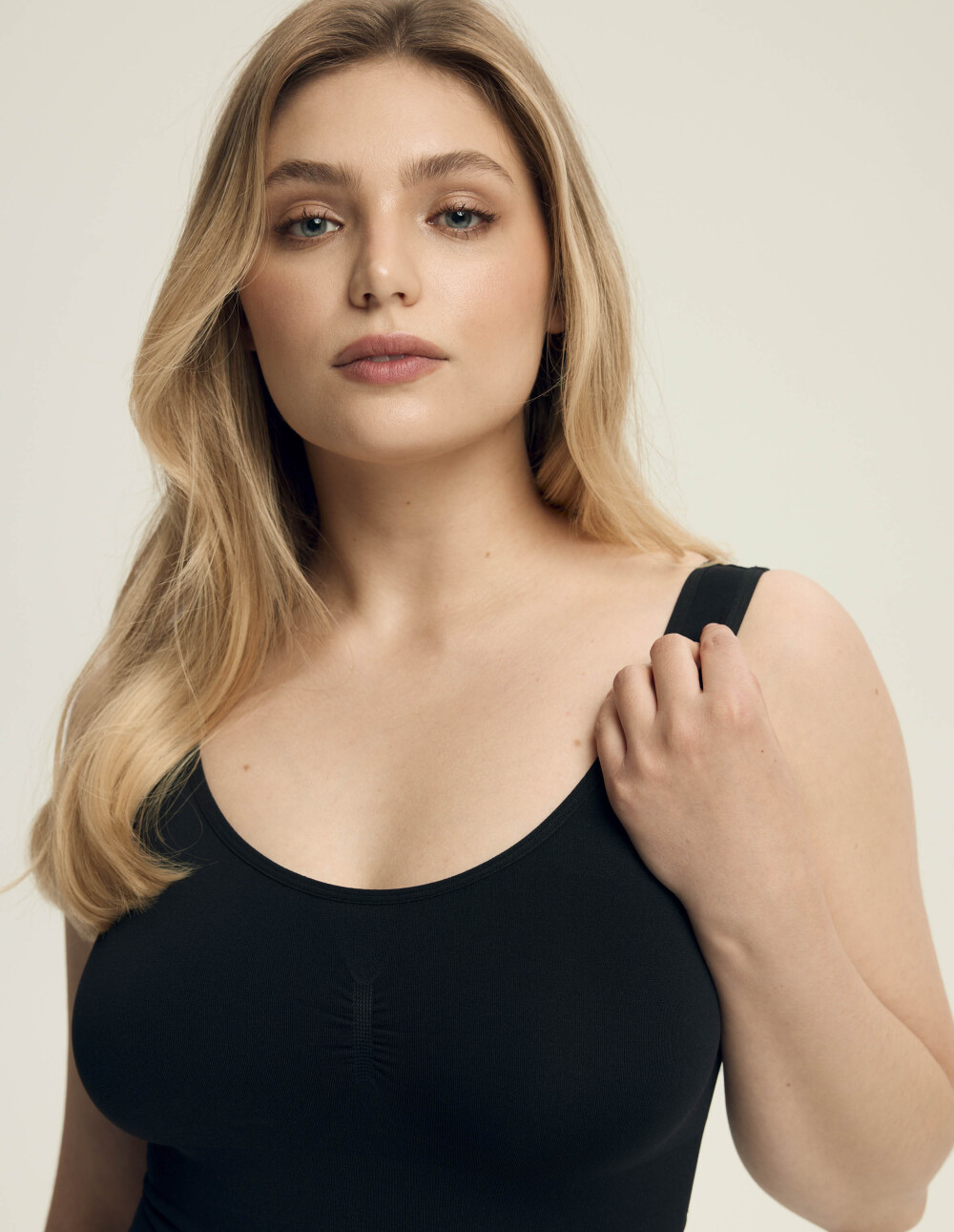 Црниот Shrinky обликувачки топ комбинира леснотија и ефикасност – нагласувајќи ги природните облини без да ја жртвува удобноста. Неговата рафинирана конструкција, со пружини кај градите, се прилагодува на различни големини без да ги израмнува градите. Нежната технологија за обликување ги истенчува клучните области – струкот, стомакот и колковите – создавајќи мазна основа за стилизирање. Силиконскиот раб го држи горниот дел на место, додека класичната црна боја додава препознатлива елеганција.