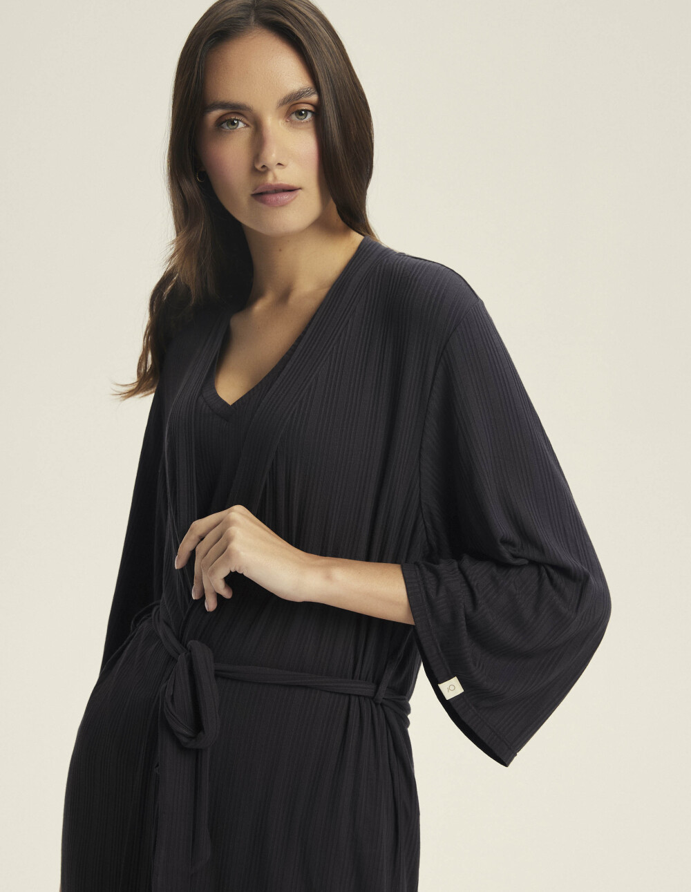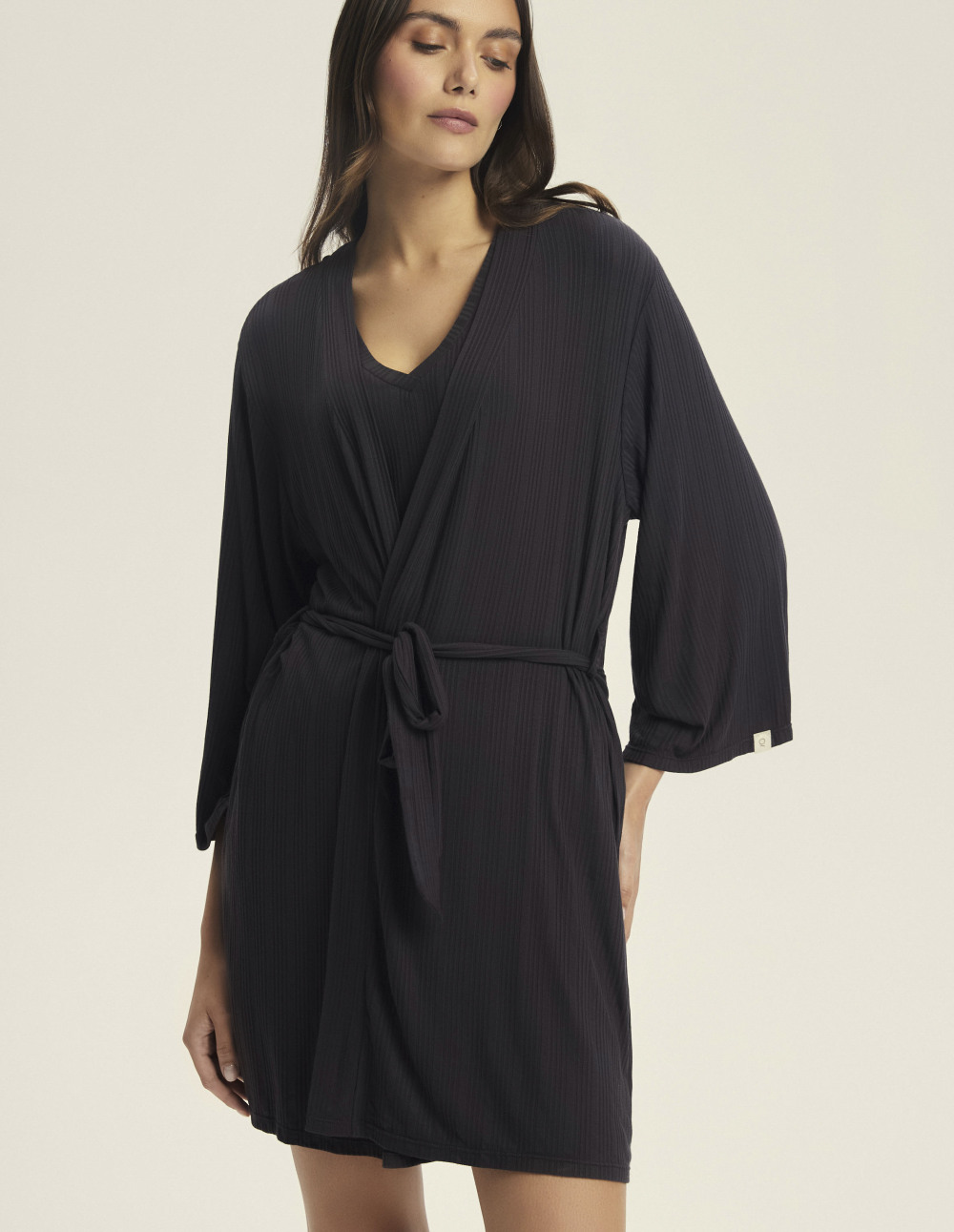 Во длабока сива боја на јаглен, бањарката Jenius го обвива телото како топол утрински шепот. Неговата нежно ребреста текстура додава мекост на секое движење, додека лесниот крој на кимоно ја ласка фигурата без вишок. Со тај-бојадисана боја на половината и широки ракави, ја комбинира секојдневната удобност со намерна елеганција. Овој класик за дома ви овозможува да се чувствувате стилски дури и кога само уживате.