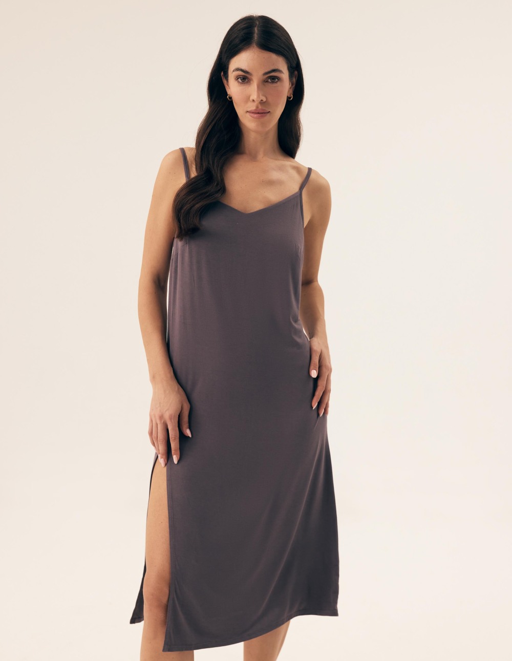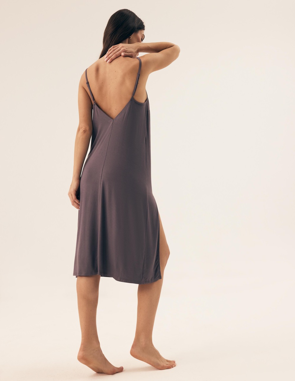 Сива ноќница до колена со тенки прерамки ќе направи да се чувствувате посебно. Изберете го вашиот омилен модел и почувствувајте се уникатно. • тенки ремени • материјал за завиткување • сензуално деколте на грбот