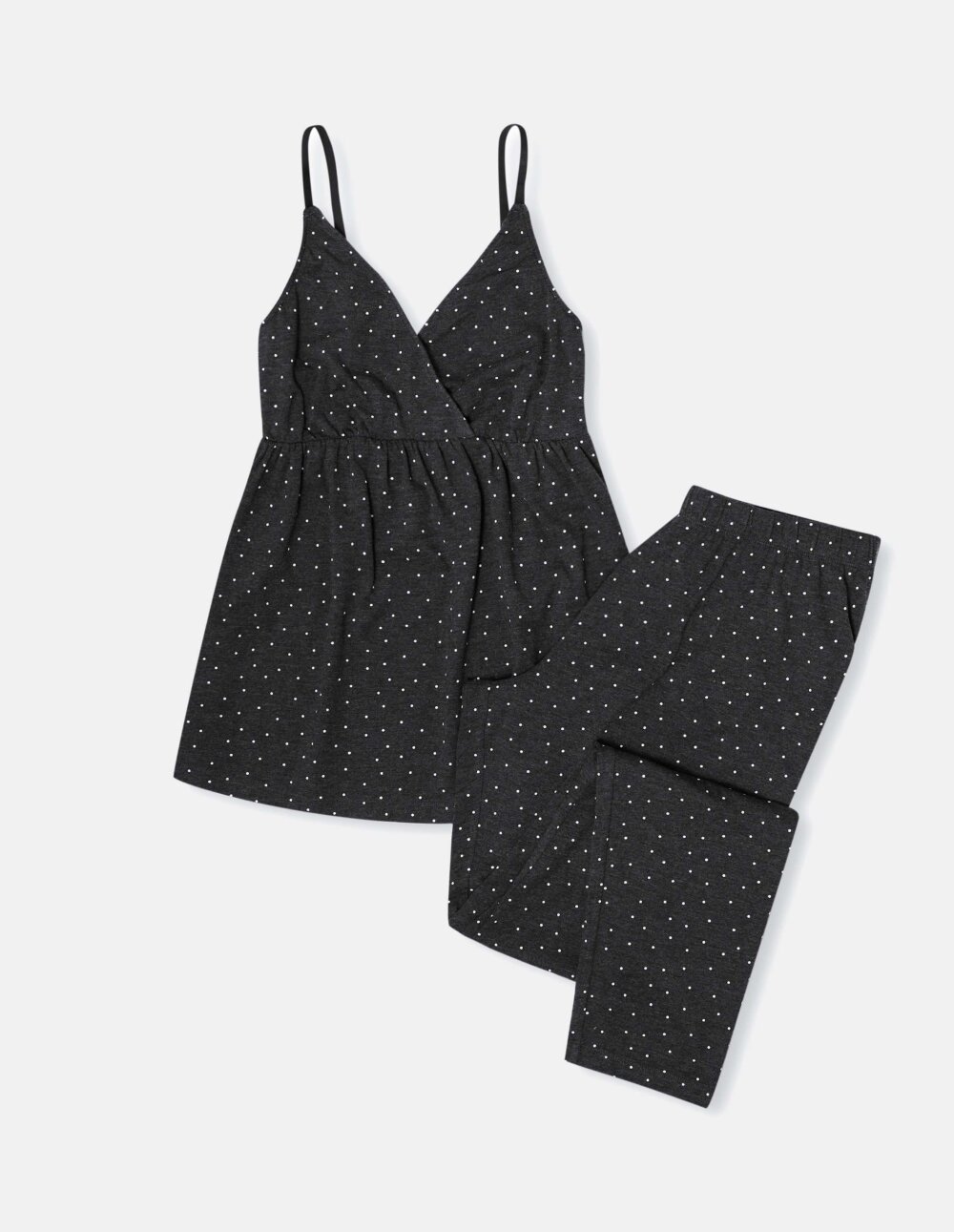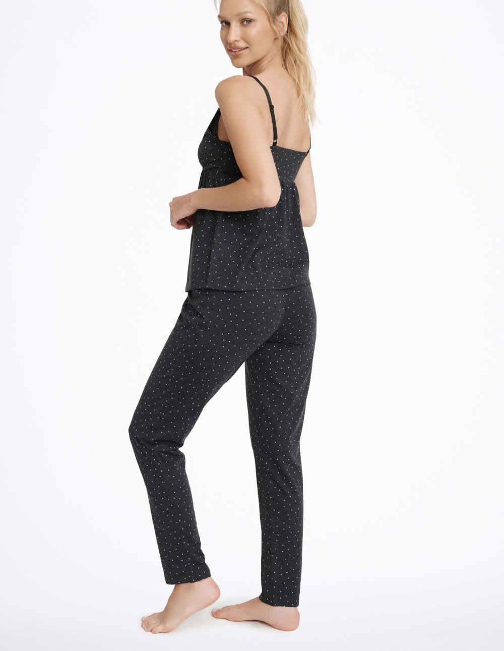 Утринските женски пижами се дизајнирани имајќи ги предвид мајките кои дојат. Комплетот се состои од горен дел со тенки прерамки и удобен долен дел кој се со долги ногавици малку заострени на крајот. Горниот дел е лабав во долниот дел и има рез под градите - можете лесно да го откачите горниот слој на градникот и е идеален за доење. Овие пижами за доење ќе ве воодушеви и со симпатичниот принт со точки. Моделот е висок 176 cm и носи големина S