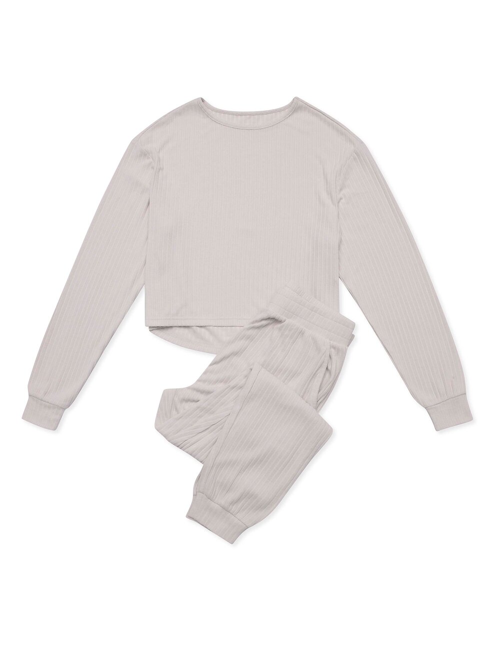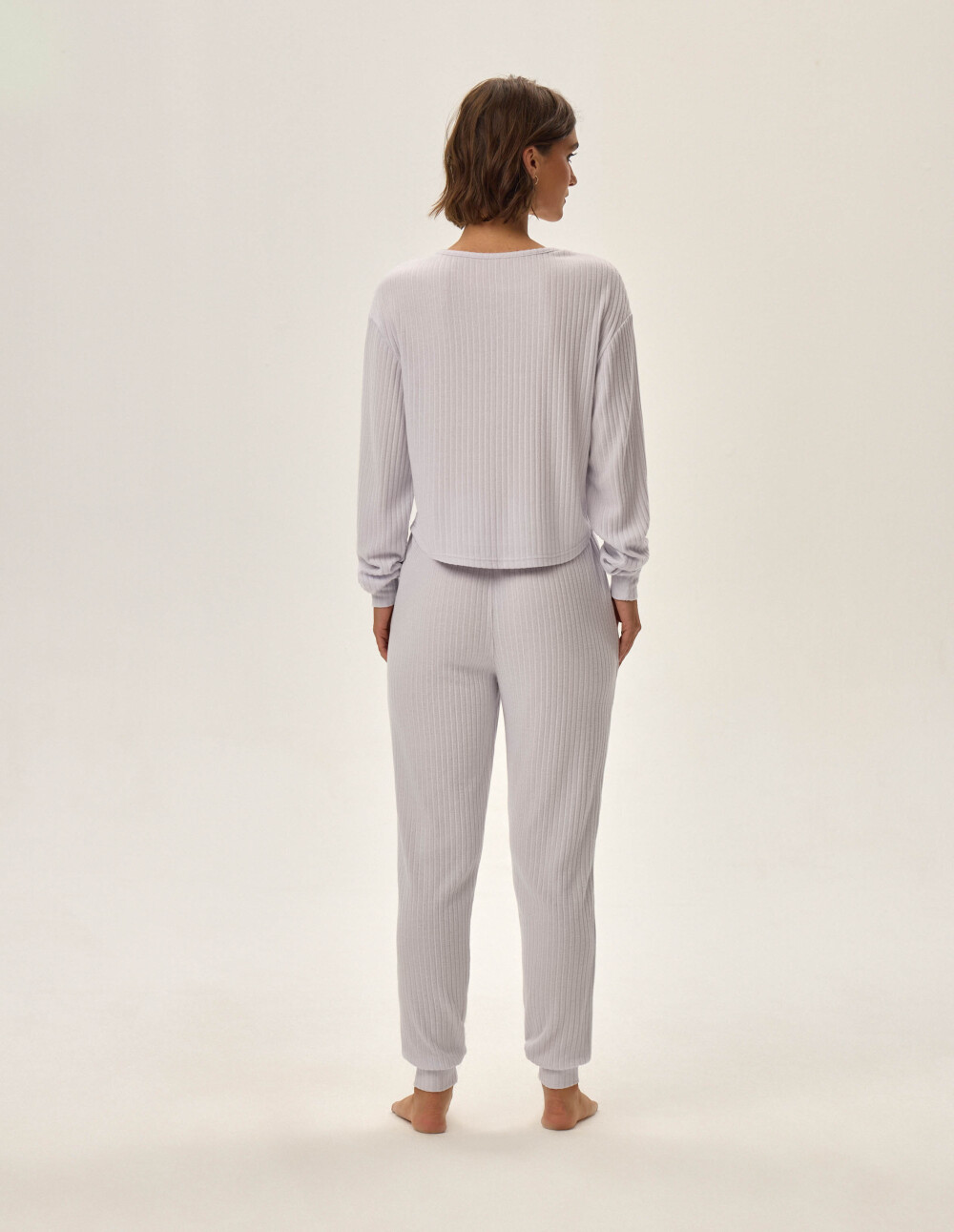 Сивиот женски комплет Clytia успешно ќе ја замени вашата омилена тренерка! Комплетот е изработен од мека, пријатна на допир ткаенина за џемпер. Неговата мирна и модерна боја дефинитивно ќе ви го олесни опуштањето дома. Ќе ви се допадне и стилот на плетениот комплет Cltyia! Пократок горен дел со надуени ракави ќе направи да се чувствувате како ѕвезда во вашиот дом. Лабавите панталони со врвка и украсни шевови на половината ќе ви овозможат удобност во секоја ситуација