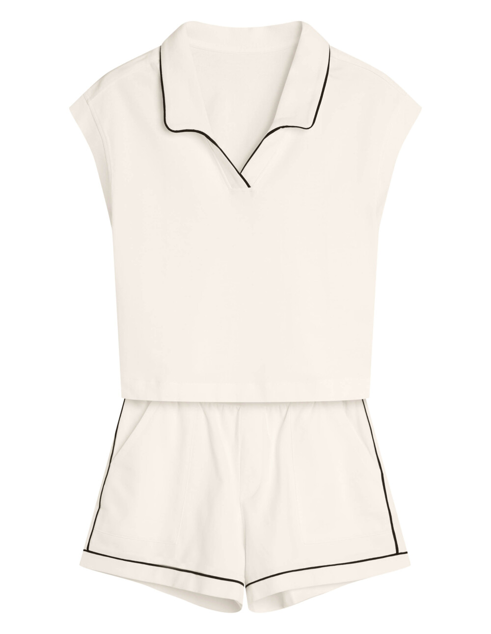 Крем верзијата на женскиот сет Remi изгледа лесно и свежо, додека темните линии по јаката, ракавите и ногавиците му даваат графички шмек. Поло маицата со кратки ракави и отворено деколте нежно паѓа преку рамената, нагласувајќи го лежерниот стил. Шорцевите имаат малку заоблени ногавици и удобен еластичен појас. Овој сет е совршен за опуштање дома, летна прошетка или утрински ритуал на кафе - практичен, но естетски пријатен.