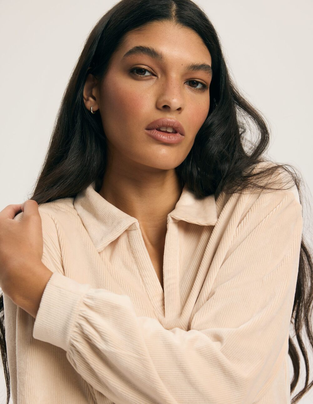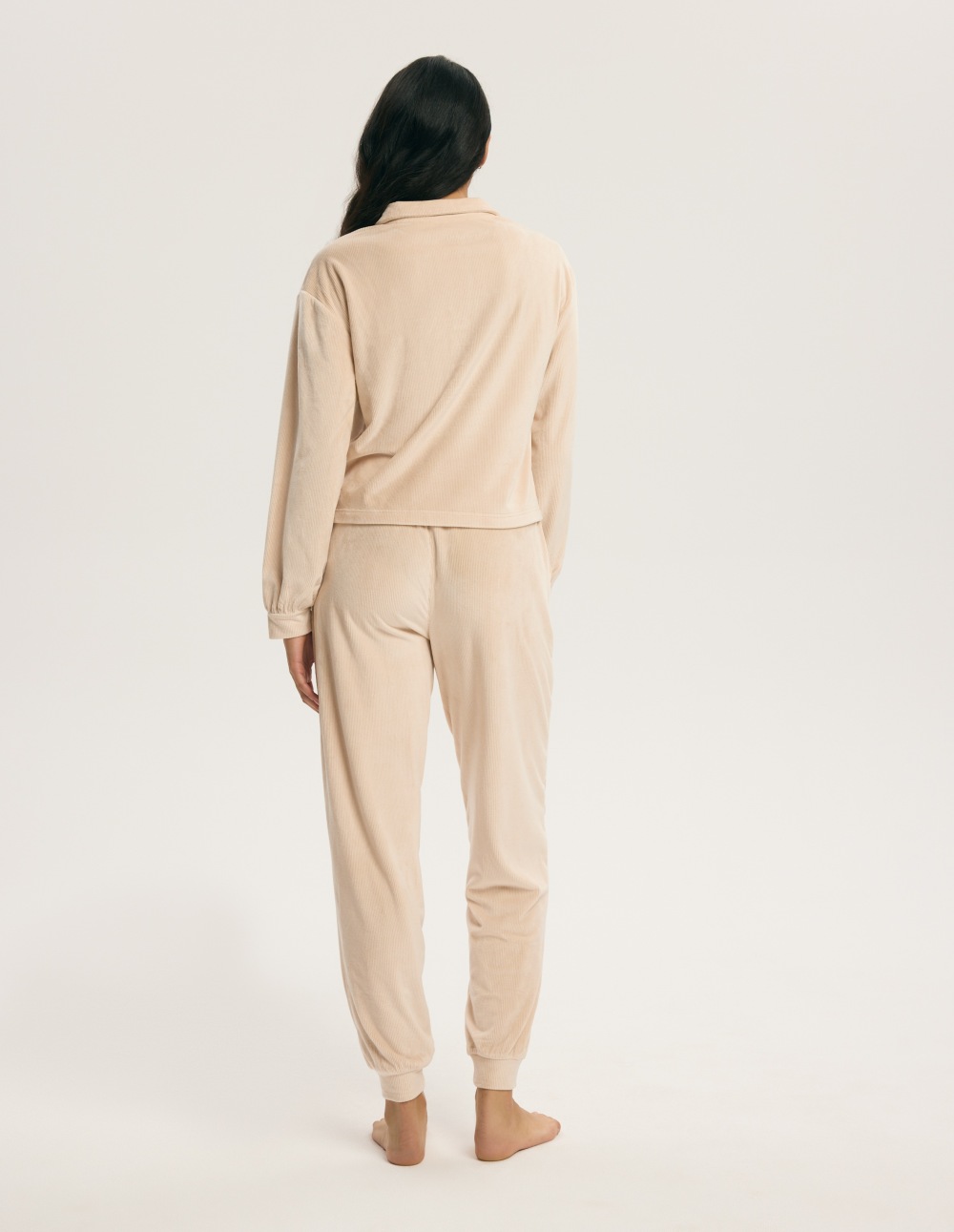 Комплетот „Кора“ во светло беж боја е допир на смиреност по долг ден. Мека, кадифена плетена ткаенина со суптилен сјај суптилно го обвиткува телото, создавајќи чувство на топлина и мекост. Горниот дел со јака и лабавиот V-изрез му даваат на ансамблот малку дискретна елеганција - таква што изгледа природно и елегантно. Лабавите панталони со еластичен појас се во согласност со естетиката на „мека удобност“ - ништо не стеснува, ништо не пречи, сè се хармонизира со телото. Беж боја „Кора“ е хармонија на домашна релаксација и женствен шик, совршена за свежи вечери и лежерни утра.