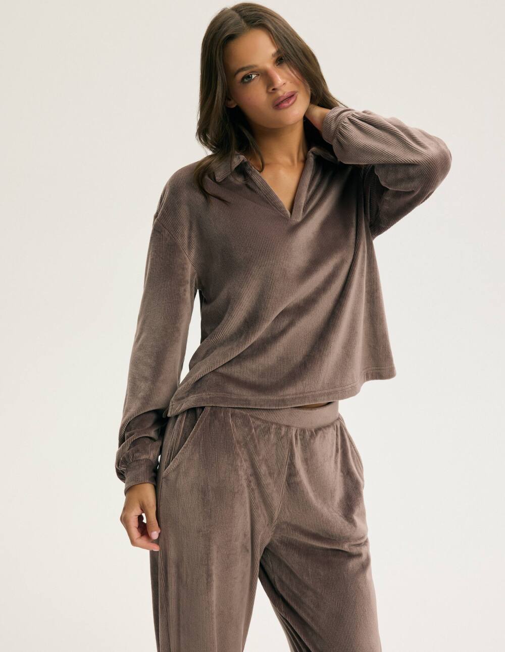 Длабоко чоколадната Кора е квинтесенција на домашната елеганција - мека, обвиткувачка и сензуална во својата едноставност. Кадифената ткаенина блеска со суптилен сјај, додавајќи топлина на секое движење. Лабавиот дуксер со јака и нежно спуштени рамена ја комбинира удобноста со безвременскиот шик, додека малку стеснетите панталони создаваат совршен спој. Овој сет е совршен за прославување на моменти за себе - кога домот станува рај, а удобноста ја добива формата на елеганција.