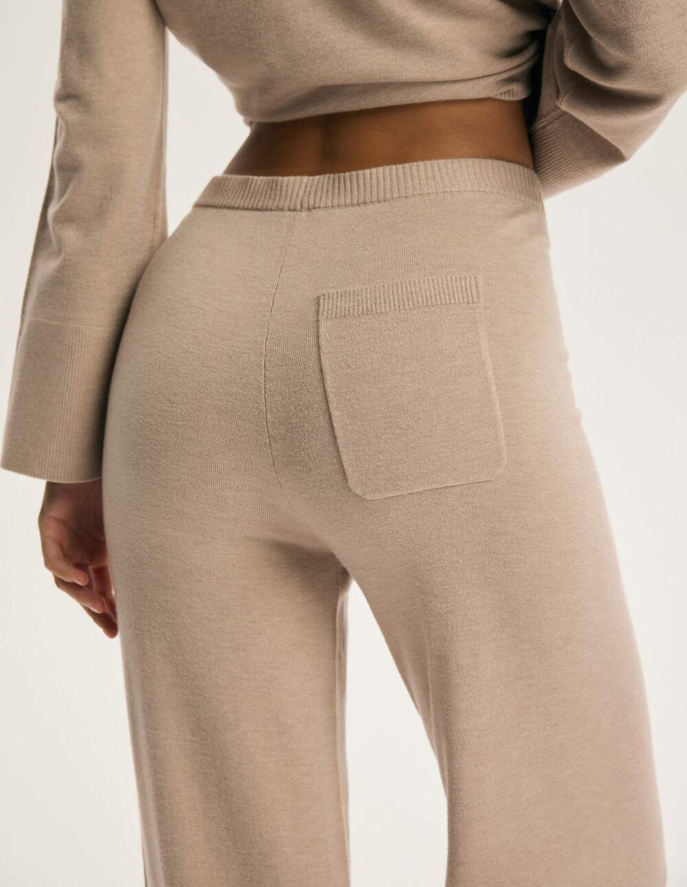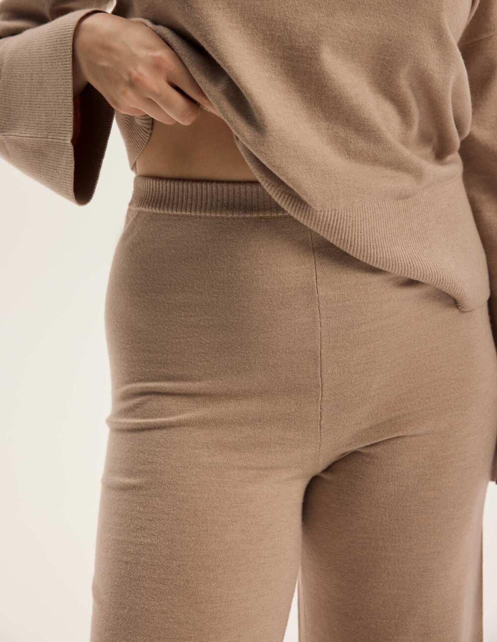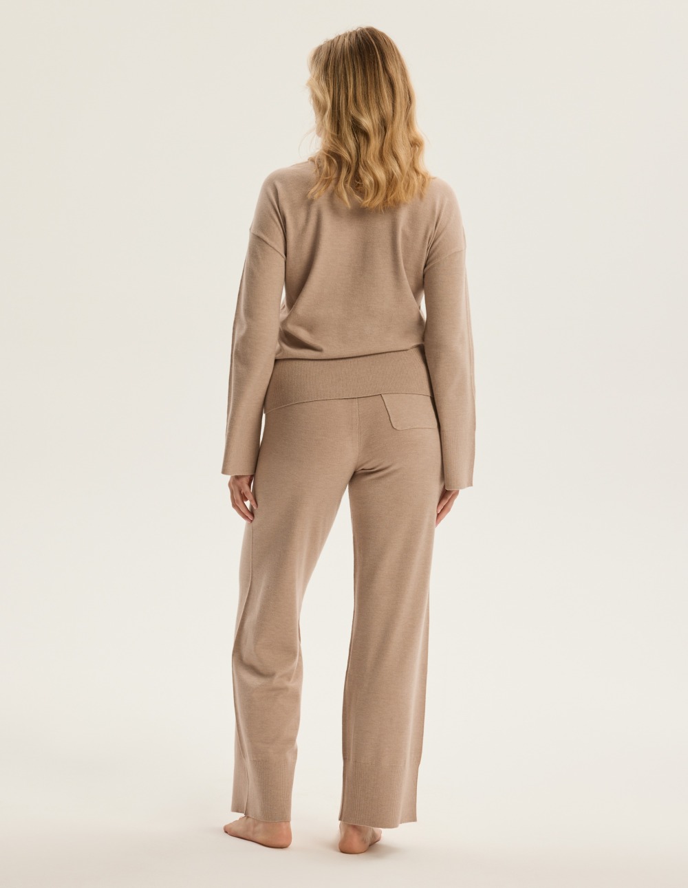 Комплетот Chilo нуди мека, плетена елеганција за дома и секојдневно носење. Лабавиот дуксер со заоблен врат се протега слободно, а широкиот, ребрест раб ја ласка секоја фигура. Панталоните имаат висок, еластичен појас и прави, пошироки ногавици со суптилен процеп на рабовите, што овозможува ткаенината да се движи со секој чекор. Практичен, рамен џеб е зашиен на задната страна. Беж бојата прекрасно додава топлина и ја истакнува мекоста на плетењето од мешавина од вискоза. Овој сет е дизајниран за удобност, но сепак доволно шик за кафе