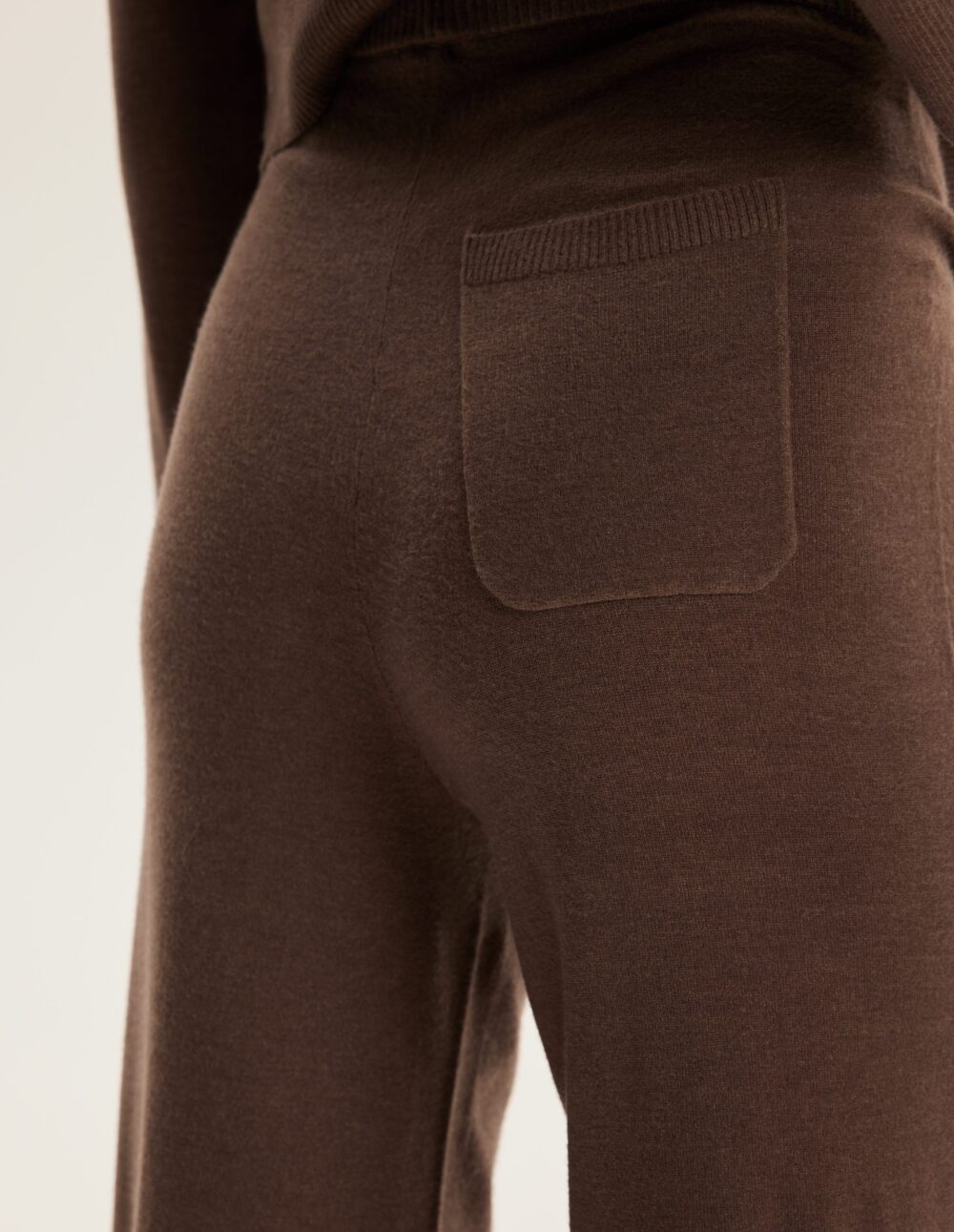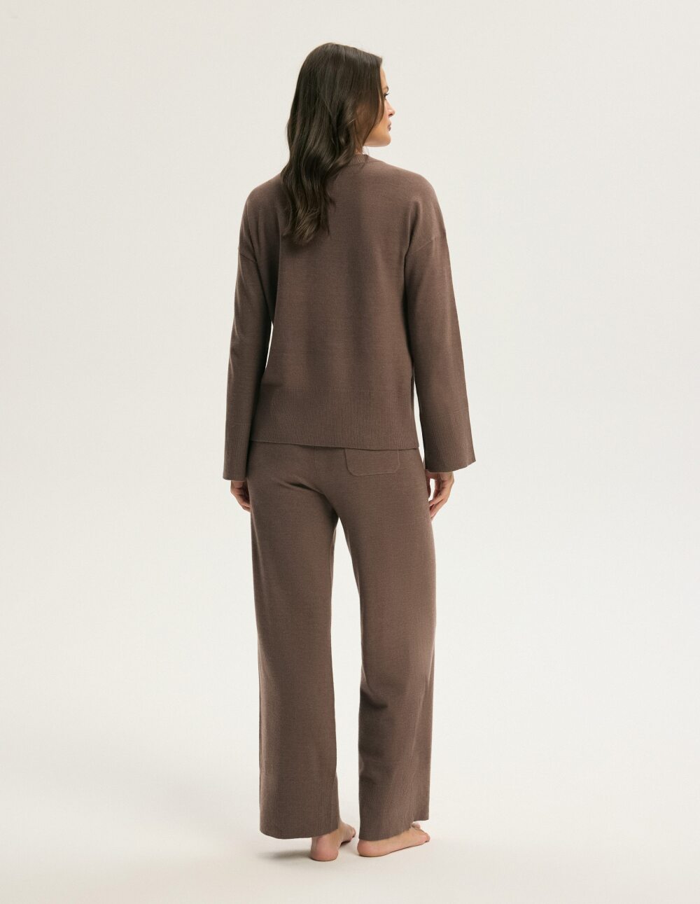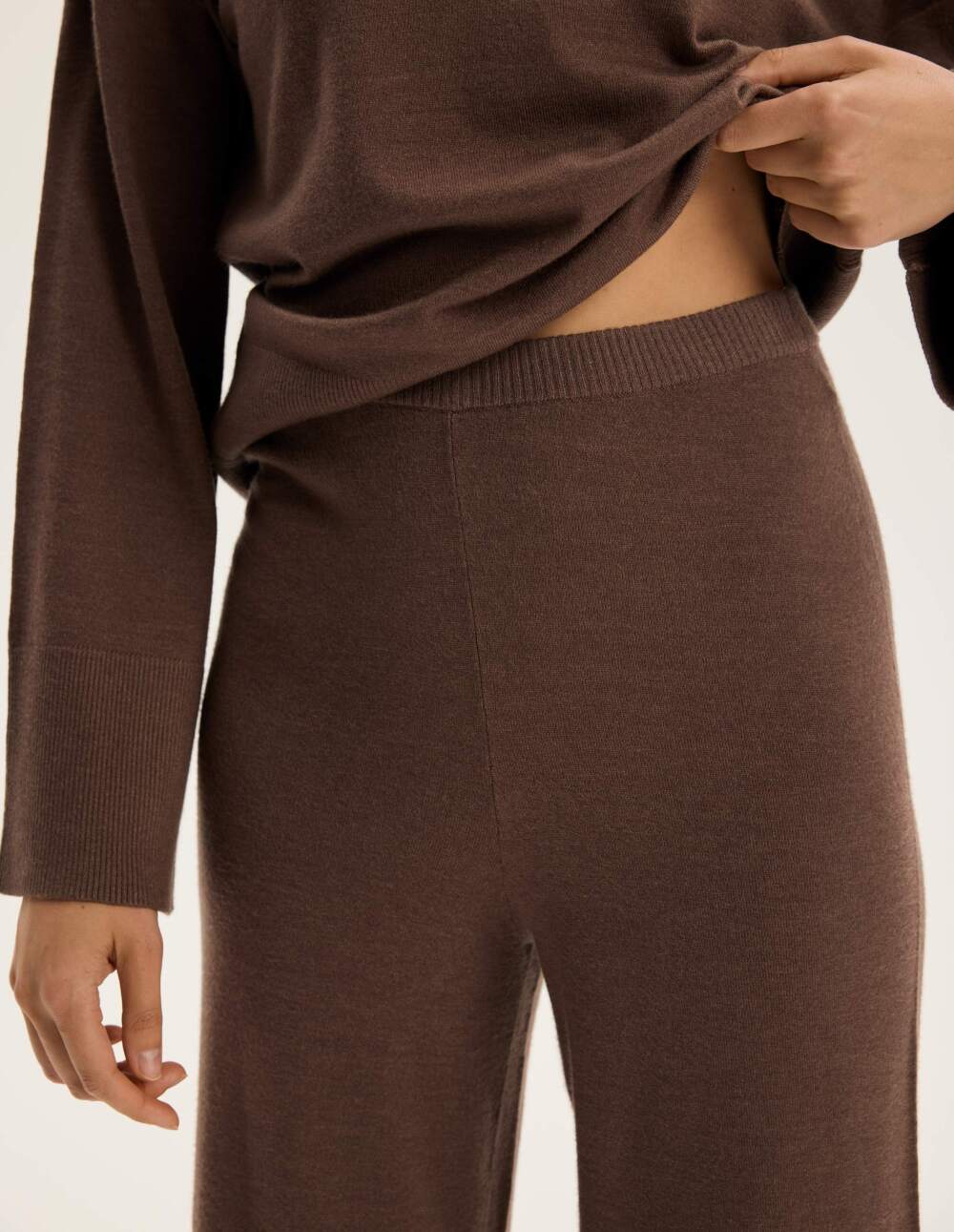 Комплетот Chilo во темно кафеава нијанса ја комбинира елеганцијата со секојдневната удобност. Меката плетена ткаенина со додадена вискоза го обвива телото со суптилна топлина, дозволувајќи ѝ на кожата да дише. Полабавиот крој на џемперот со малку спуштени рамена овозможува лесно движење, додека долгите ракави со прави рабови додаваат минималистички допир. Широкиот, ребрест појас на долниот дел од блузата внесува допир на модерна леснотија и создава грациозна и пропорционална силуета. Пантолоните со рамена гарантираат целодневна удобност, додека суптилните прорези на рабовите додаваат женствен допир. Практичен џеб се наоѓа на задната страна, веднаш под половината, разбивајќи ја едноставноста на дизајнот и дискретно нагласувајќи ги колковите.