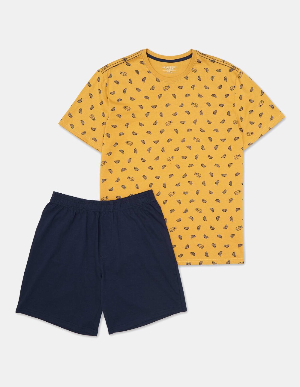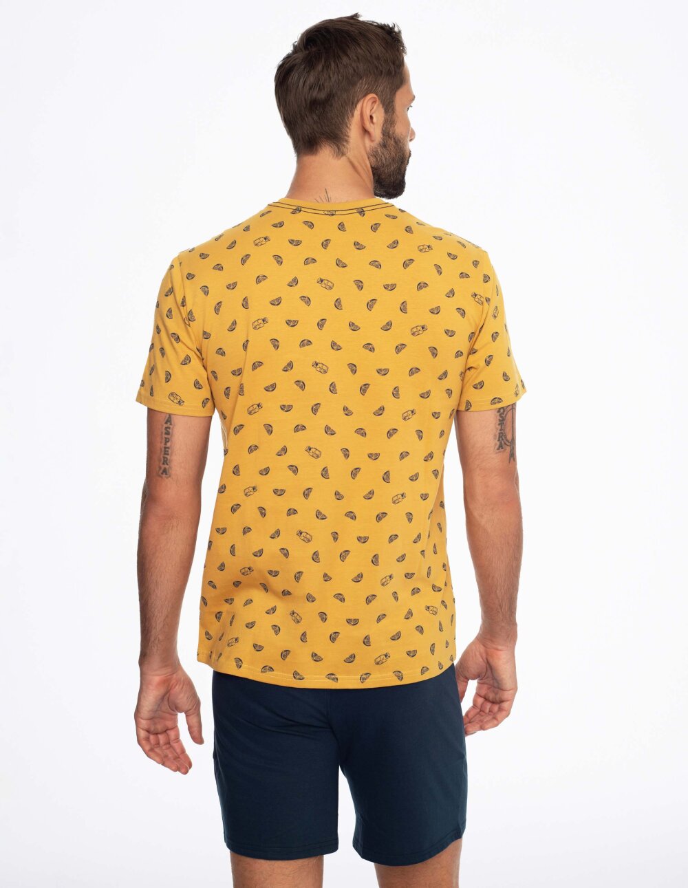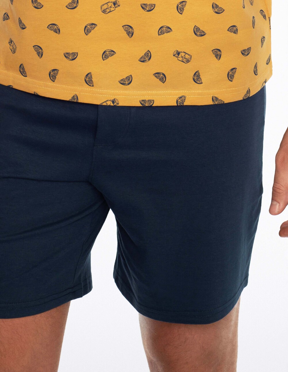 Дали сакате да се истакнувате дури и додека спиете? Клу пижамите се летен комплет за спиење со уникатна маичка - сенф жолта и со принт од лимон. Маичка со кратки ракави и тркалезно деколте е комбинирана со еднобојни шорцеви. Лабавиот крој на овој комплет пижами овозможува слобода на движење, а меката ткаенина е многу пријатна на допир.