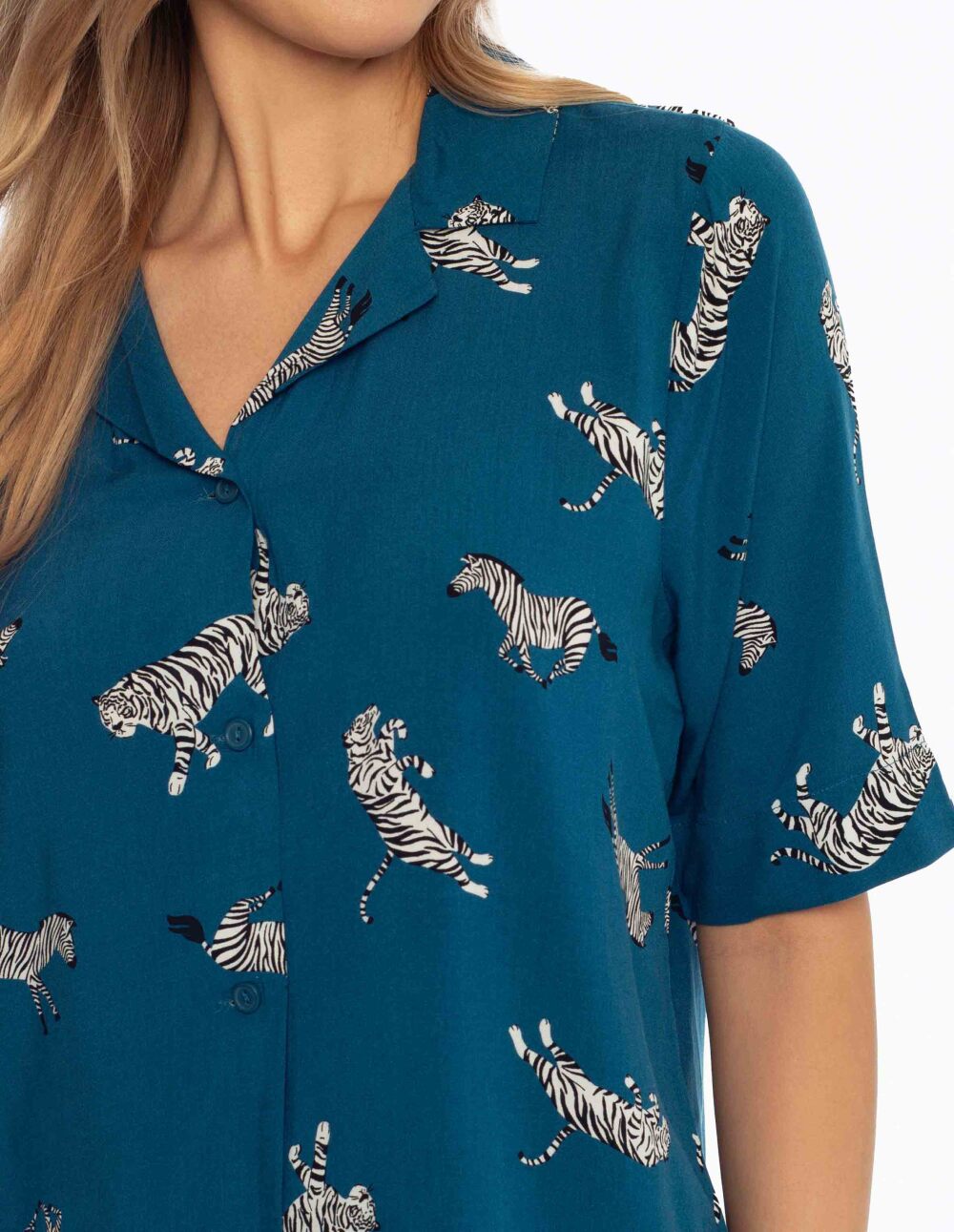 Воздушните женски пижами се интересна комбинација на класична елеганција и модерност. Горниот дел од кошулата со широк крој што не го ограничува движењето и зелените шорцеви потсетуваат на униформа. Оригиналниот принт на зебра и тигар малку го менува традиционалниот стил на пижами Airy и им додава карактер. Пижамите се целосно направени од мека вискоза пријатна за телото.