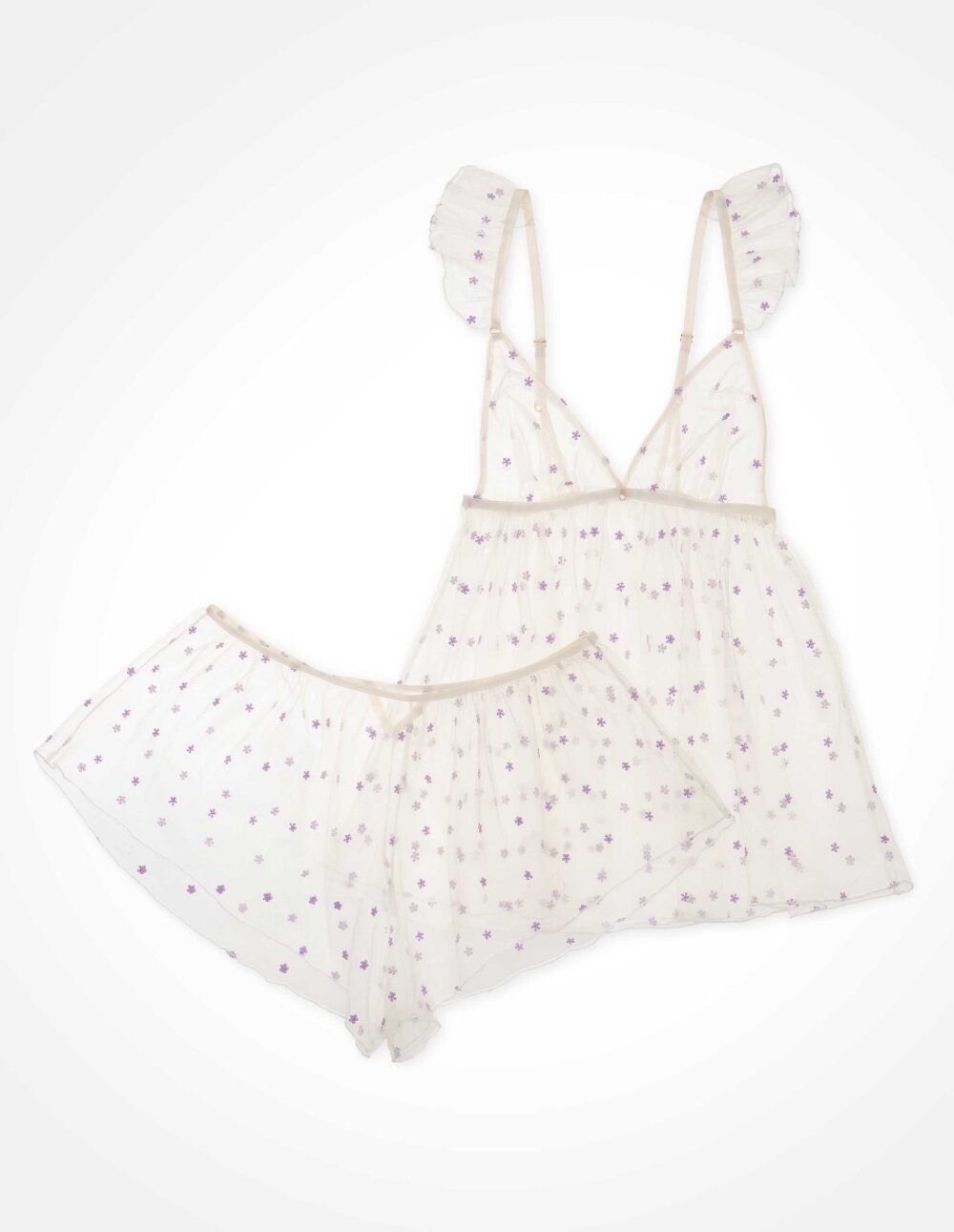 Разгорувајќи ги сетилата, белиот сет на Holly изработен од проѕирна мрежа е совршен избор за посебни вечери и возбудливи утра. Воздушна, отсечена маичка со украсни возбудувања суптилно ги истакнува предностите на телото. Совршено оди со кратки шорцеви со широки, удобни ногавици. Деликатната, виолетова шема на цвеќиња го привлекува вниманието