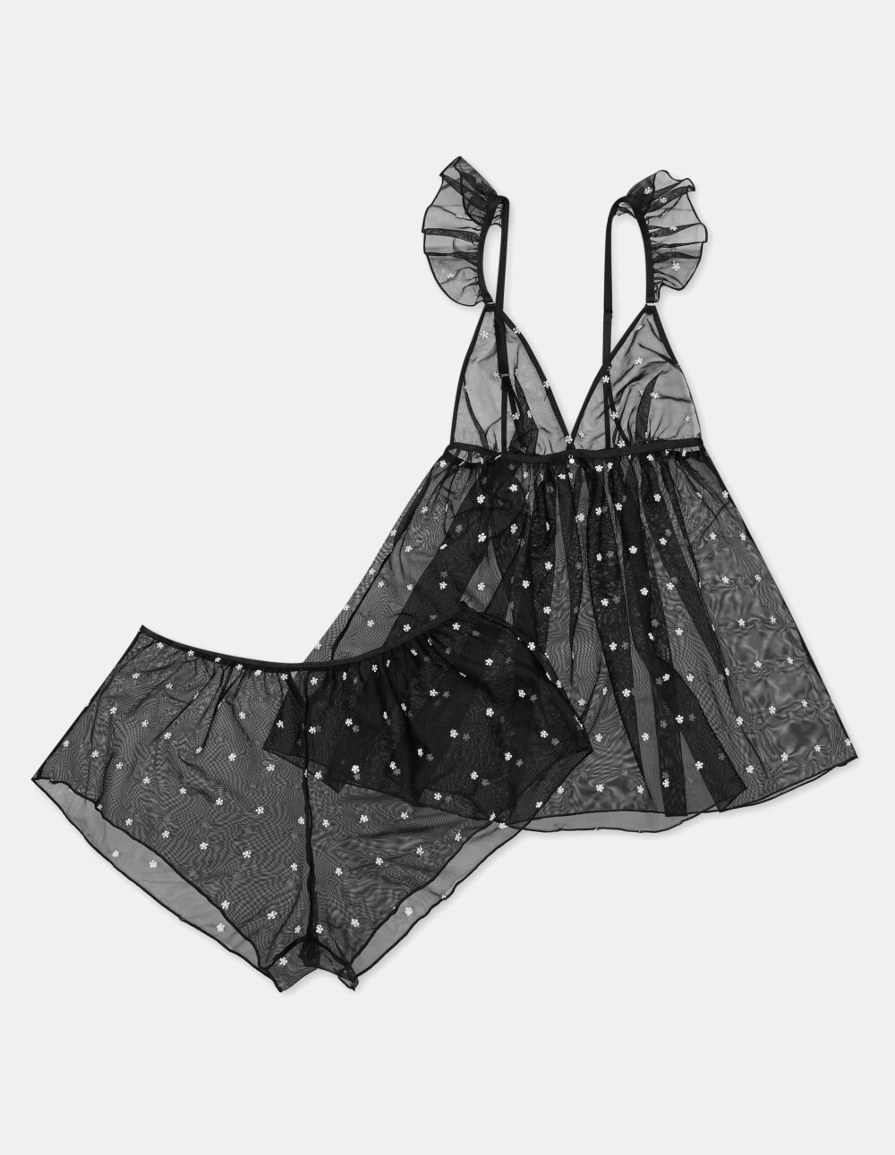 Црниот комплет Холи е долна облека која ќе ја нагласи вашата самодоверба. Благодарение на употребата на проѕирна мрежа со дезен од бели цветови, изгледа исклучително шармантно. Кратки, широки шорцеви и маичка отсечена под бистата со украсни возбудувања ја будат фантазијата. Обрнете внимание и на ремените одзади - тие се украсени со златни прстени.